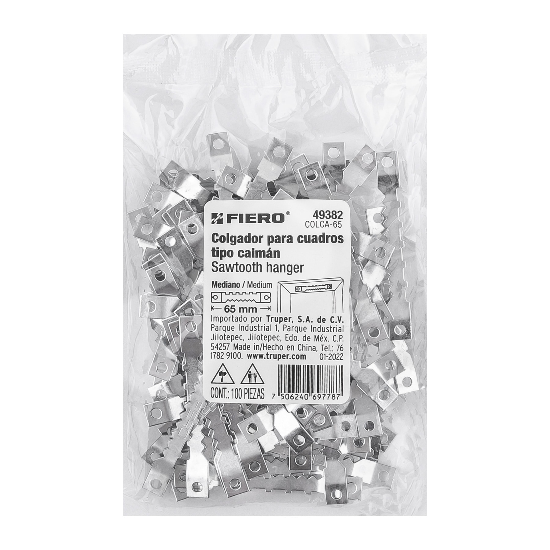 Bolsa con 100 colgadores de 65 mm tipo caimán, FIERO