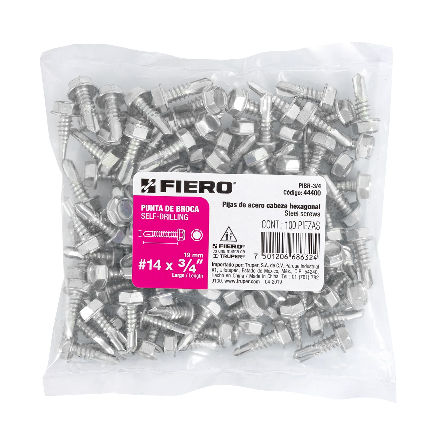 Bolsa con 100 pijas 3/4′ cabeza hexagonal, punta de broca