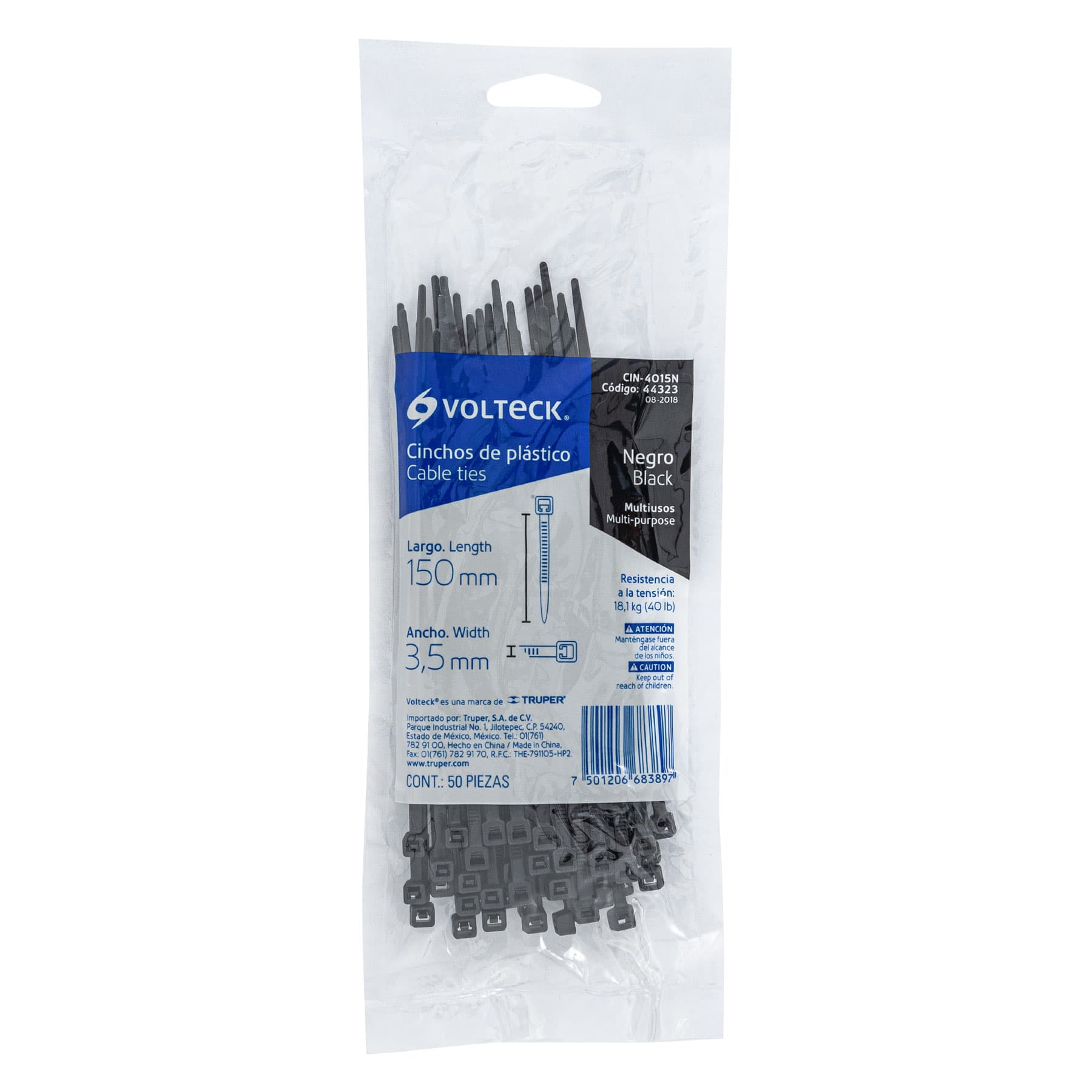 Bolsa con 50 cinchos plásticos 40 lb, 150×3.5 mm, negros