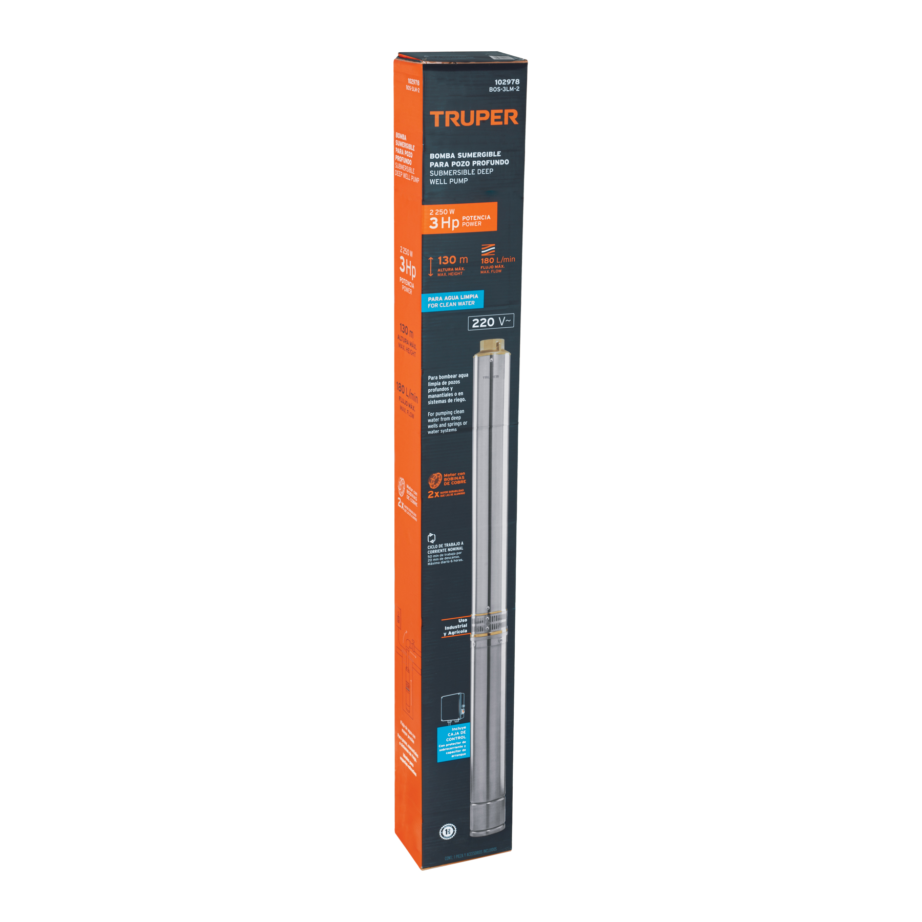 Bomba sumergible tipo bala, 3HP, uso agrícola, 220V, TRUPER