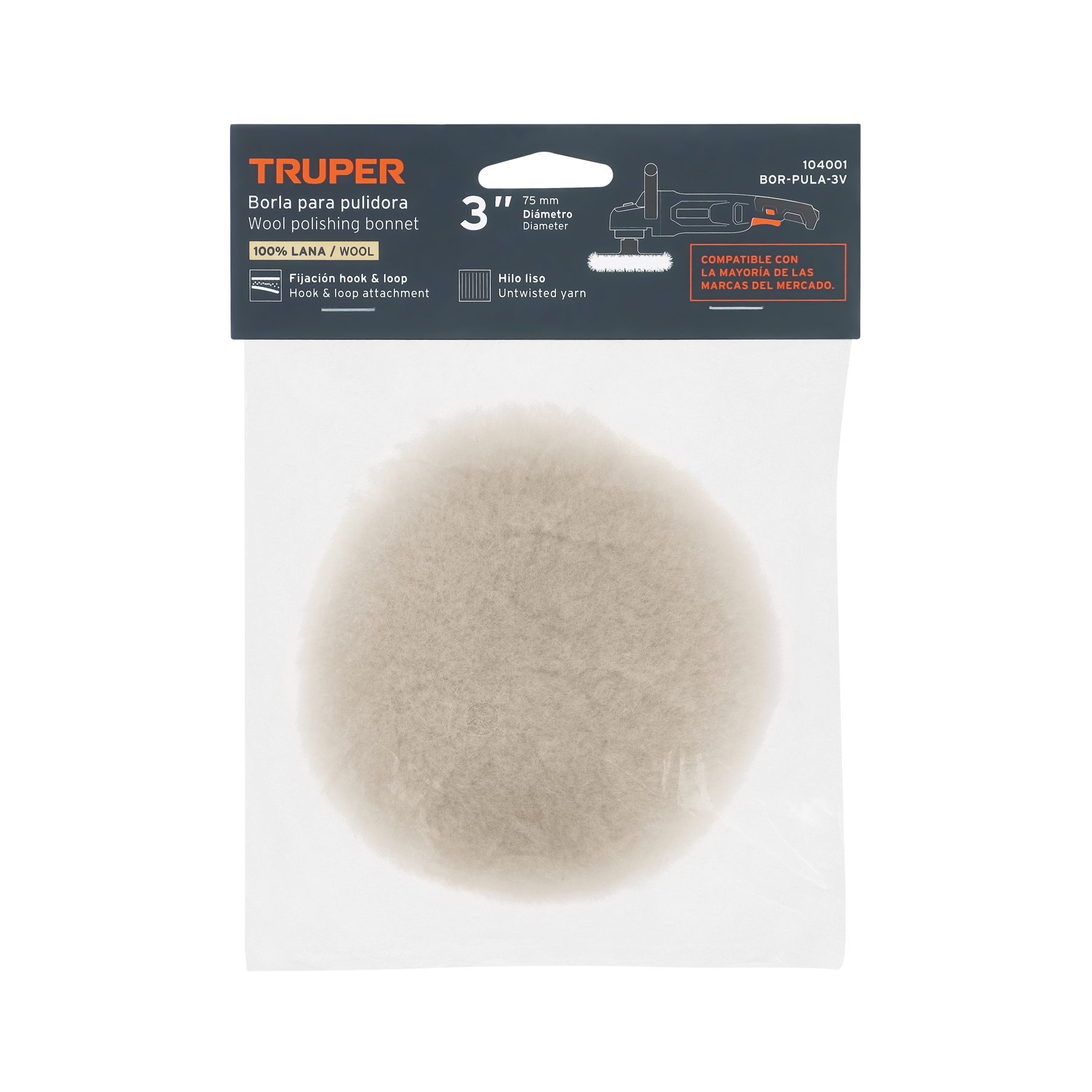 Borla p/pulir de lana de 3′ hook and loop, TRUPER