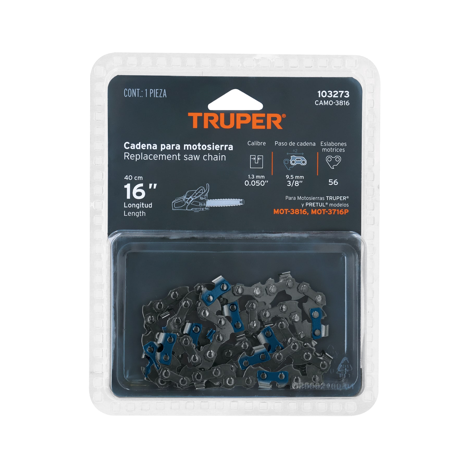 Cadena de repuesto 16′ p/motosierra a gasolina 38cc, TRUPER