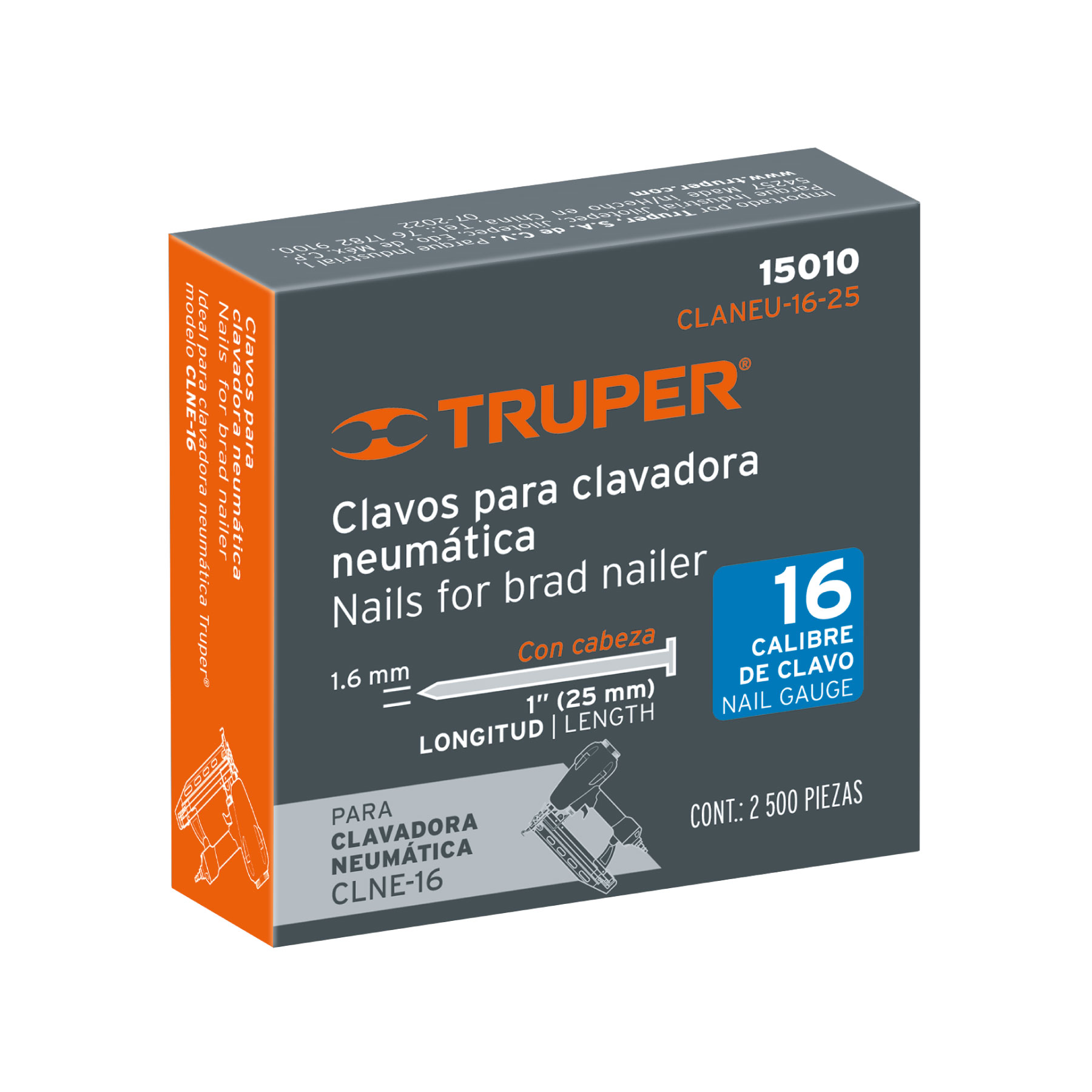 Caja con 2500 clavos calibre 16, 25 mm para CLNE-16, Truper