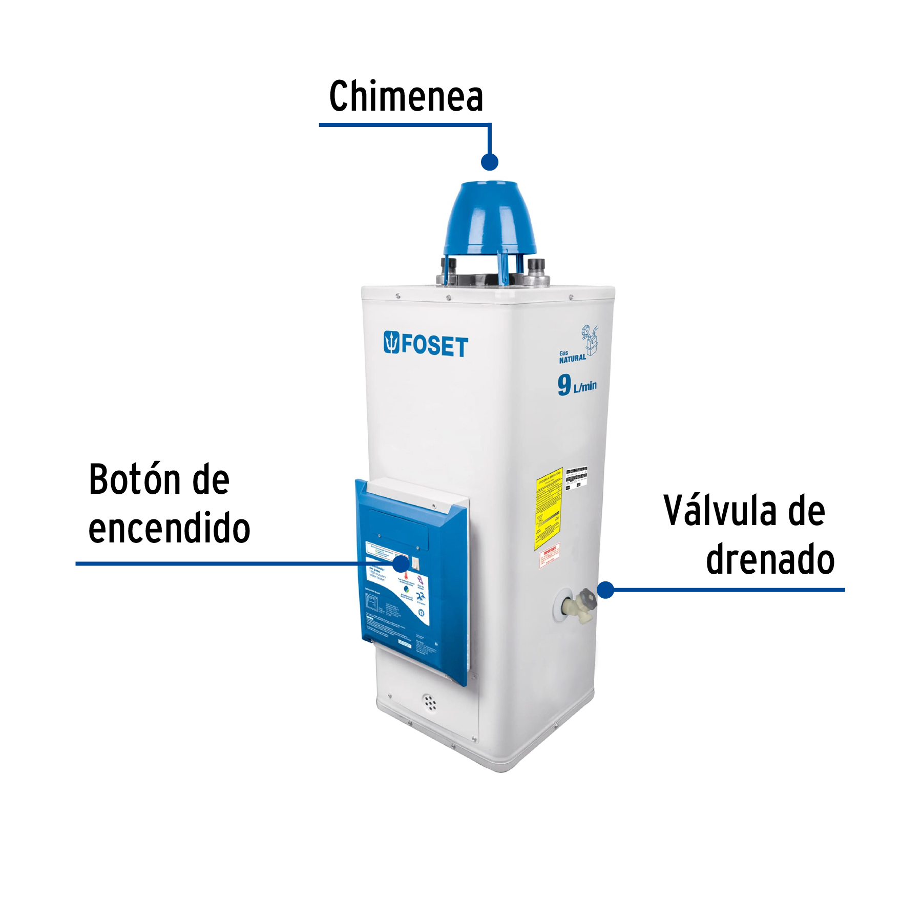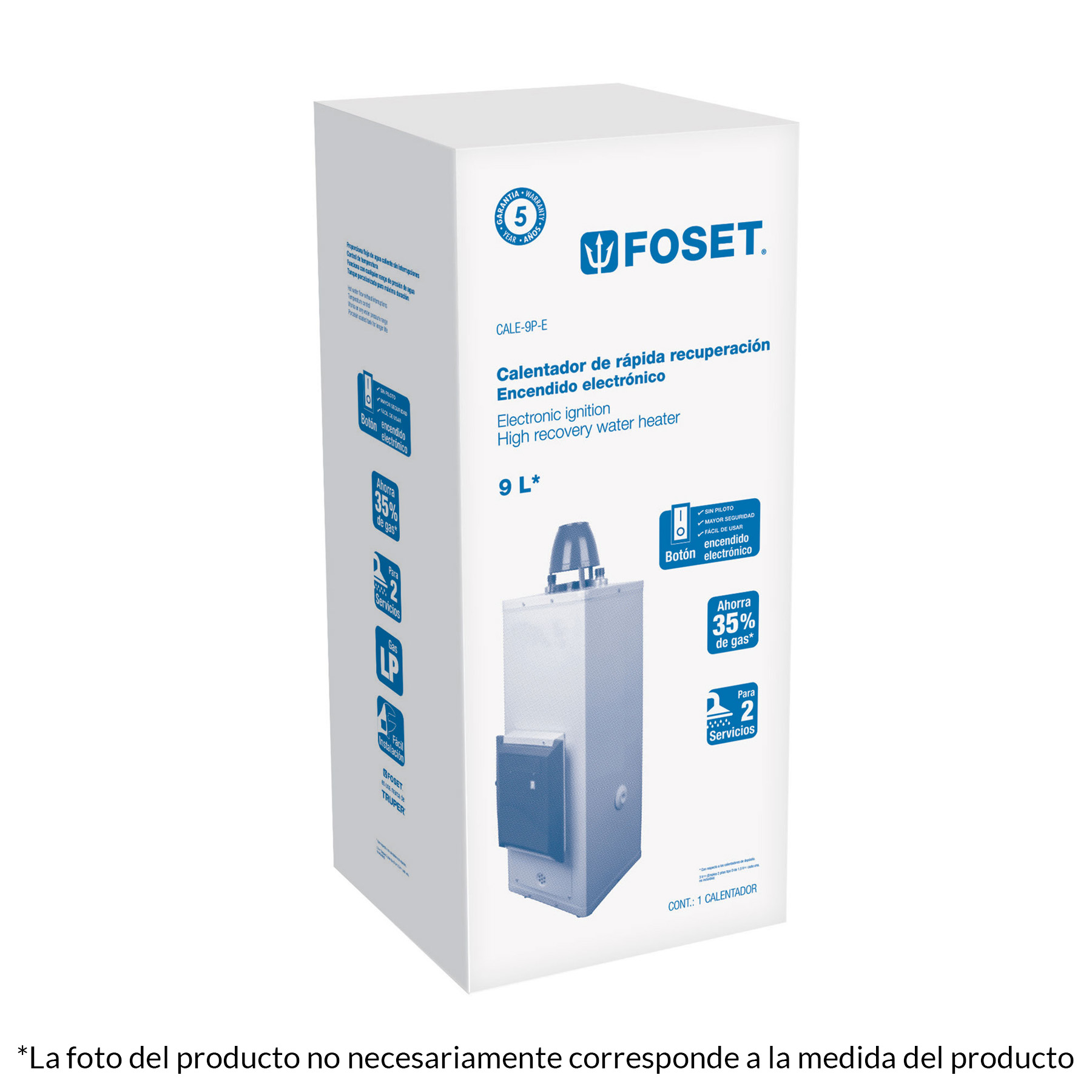 Calentador de paso, electrónico, 9L, 2 serv, gas nat, Foset
