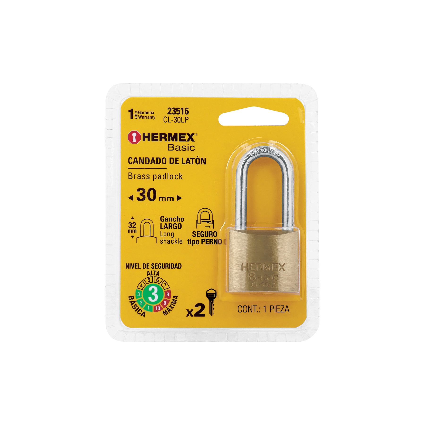 Candado de latón 30 mm gancho largo en blíster, HERMEX BASIC