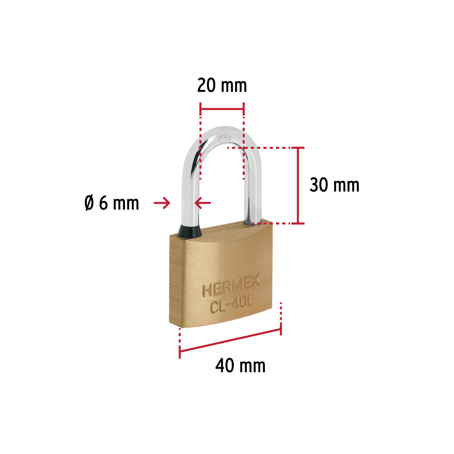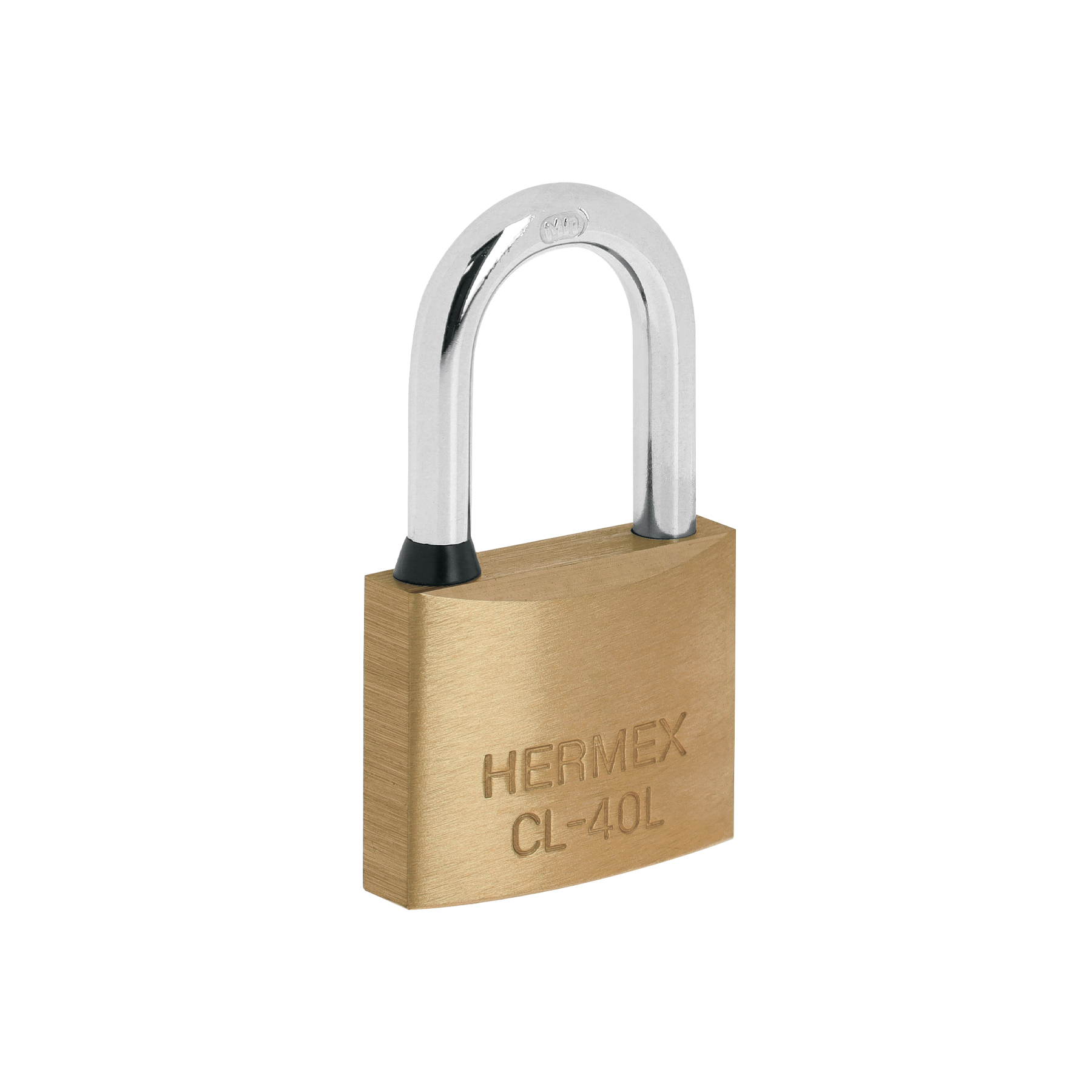 Candado de latón 40 mm gancho largo en blíster, HERMEX