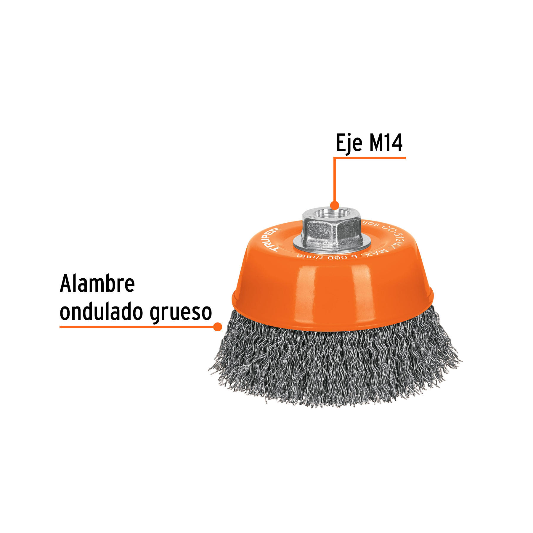 Carda copa 5′ alambre ondulado grueso, eje M14, Truper
