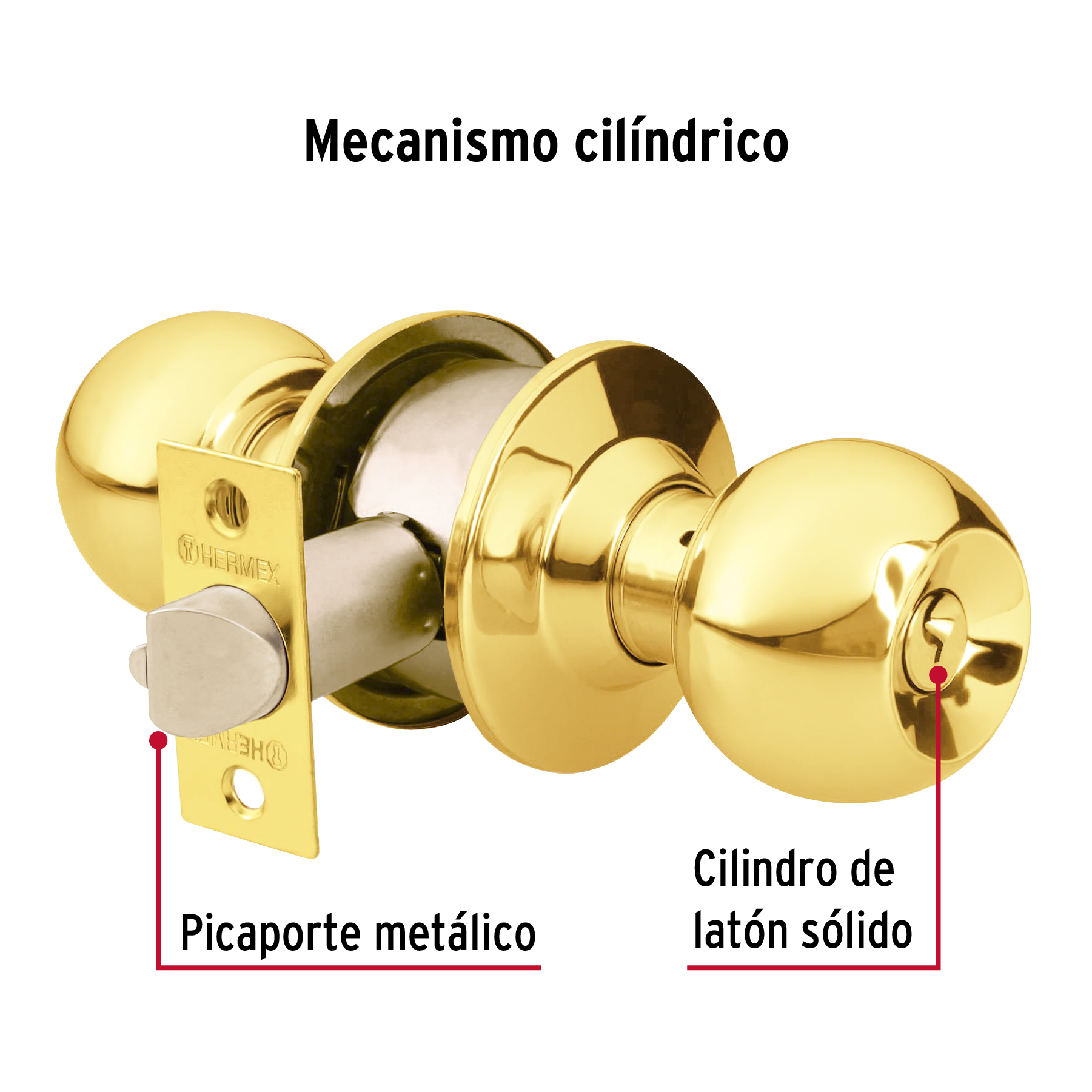 Cerradura tipo esfera para recámara, latón brillante, HERMEX