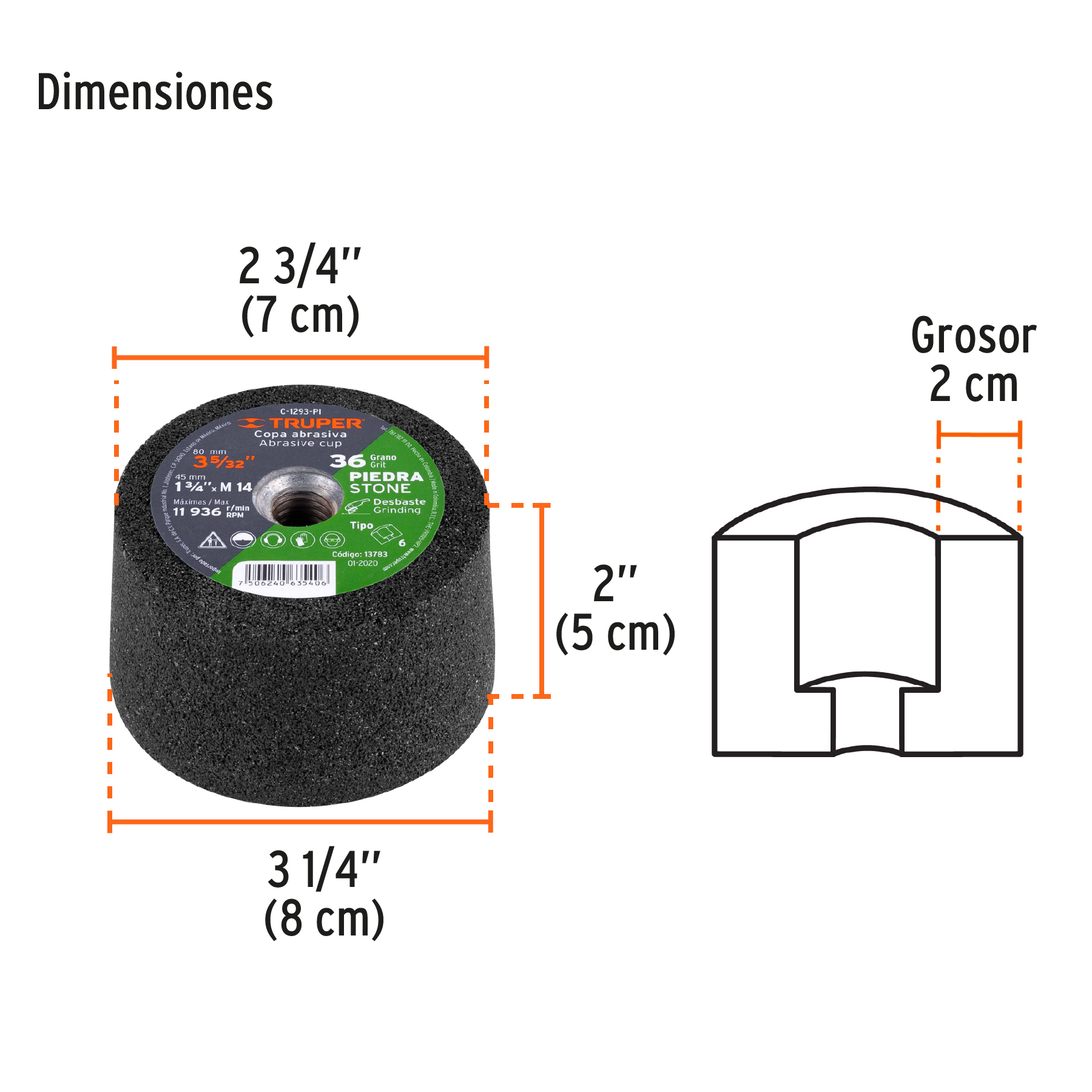 Copa desbaste de piedra 3-5/32′ grano 36, eje M14, Truper