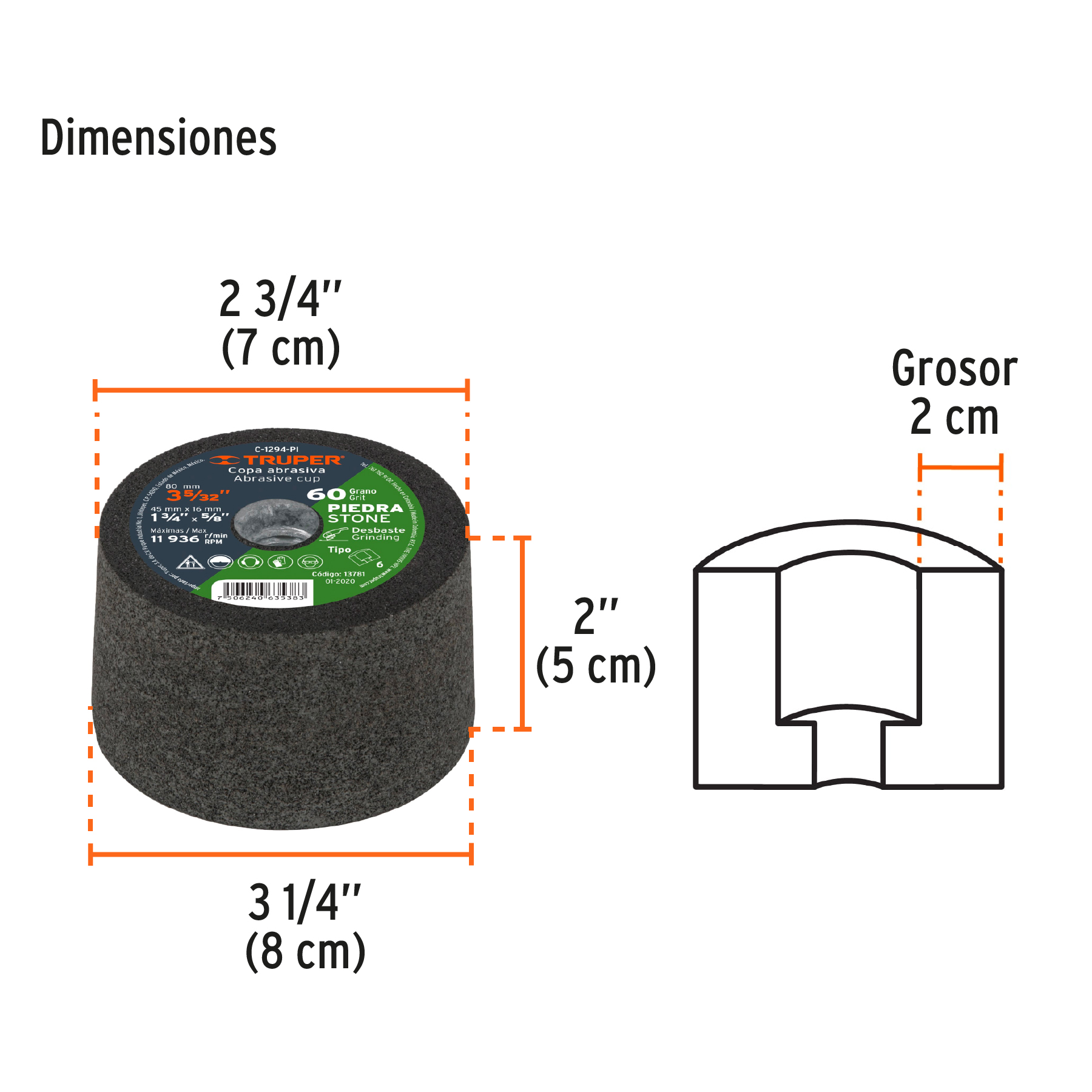 Copa desbaste de piedra 3-5/32′ grano 60, eje 5/8-11, Truper