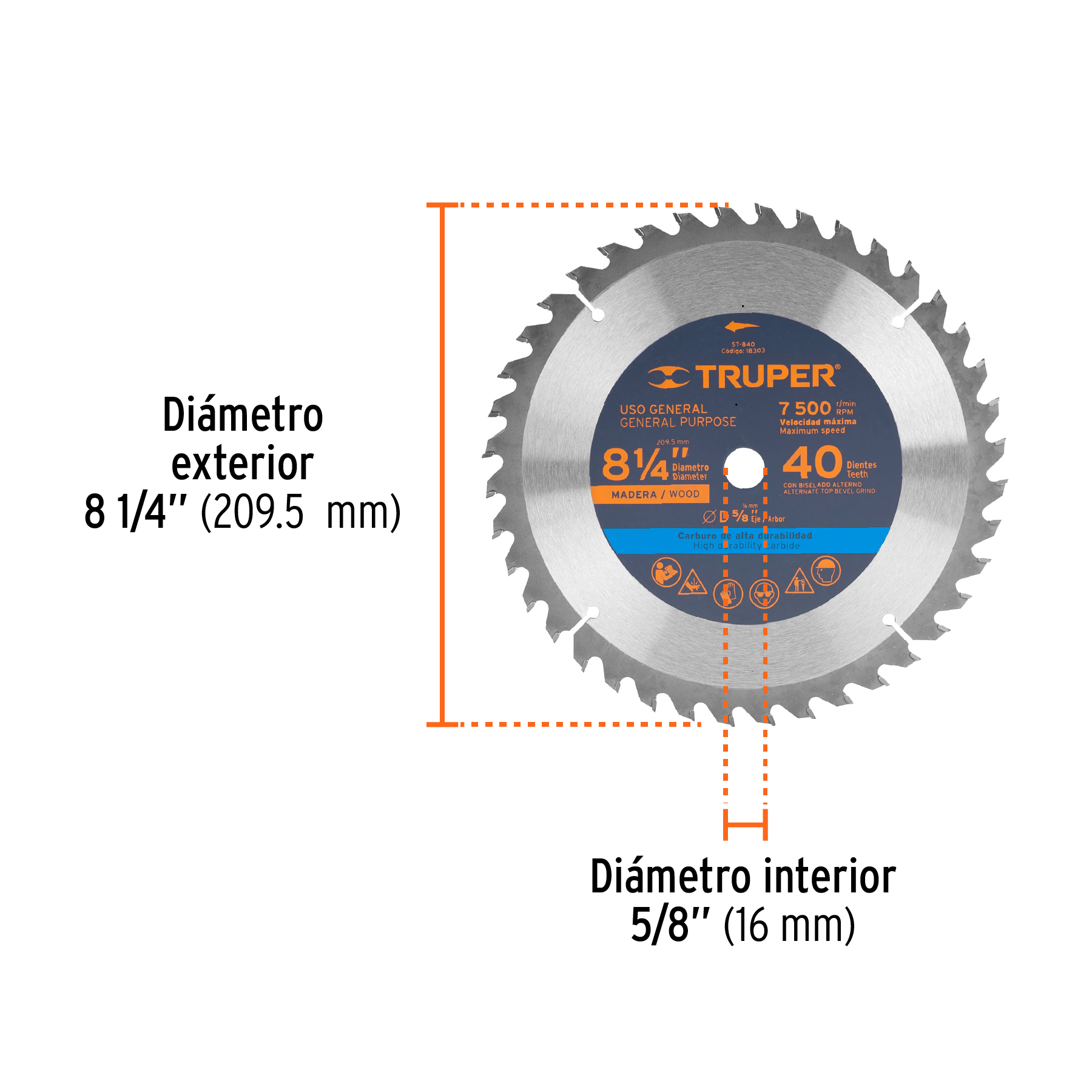 Disco sierra 8-1/4′ para madera, 40 dientes centro 5/8′