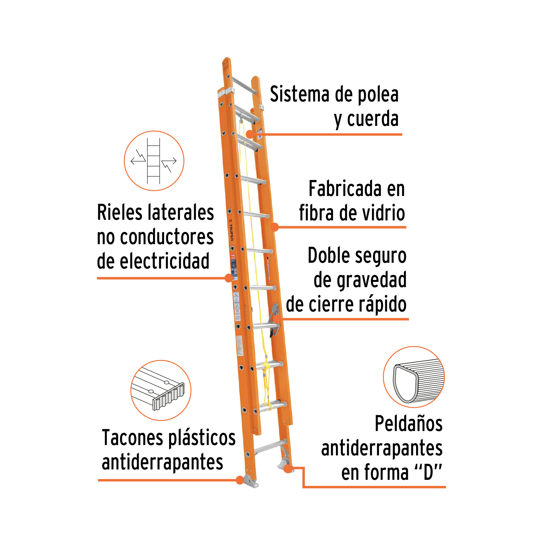 Escalera de extensión, tipo II, 28 peldaños, fibra de vidrio