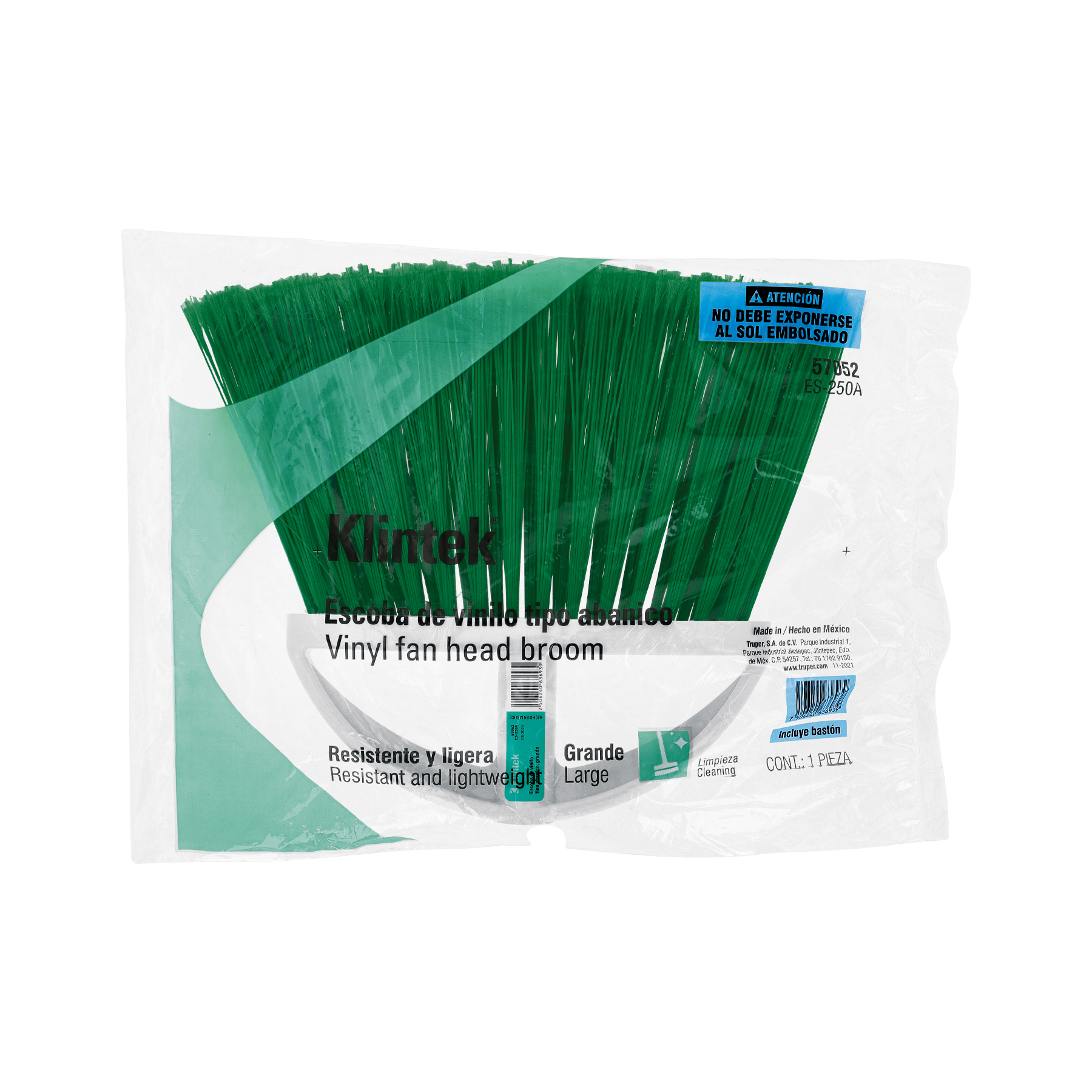 Escoba grande tipo abanico, cerdas de PVC, bastón de madera