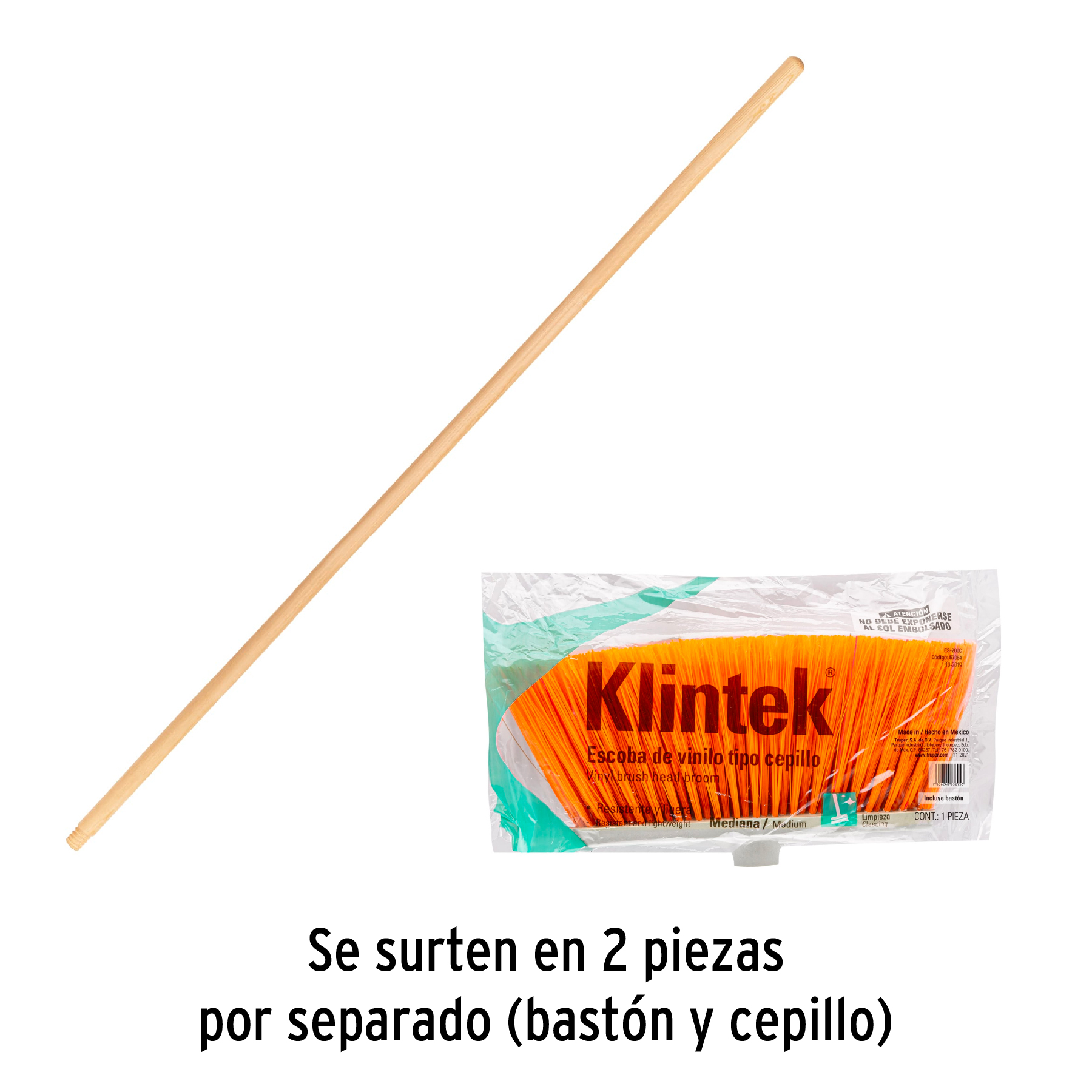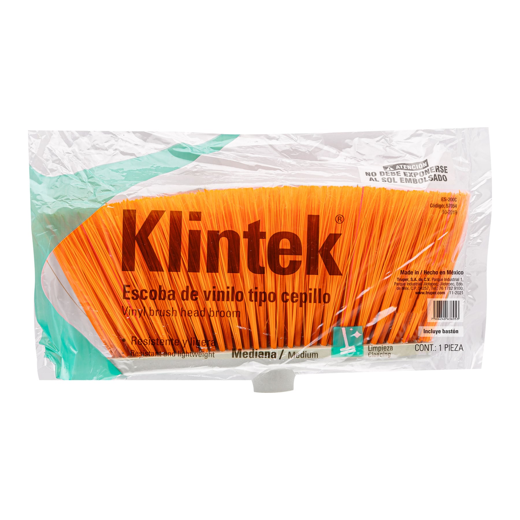 Escoba mediana tipo cepillo, cerdas de PVC, bastón de madera
