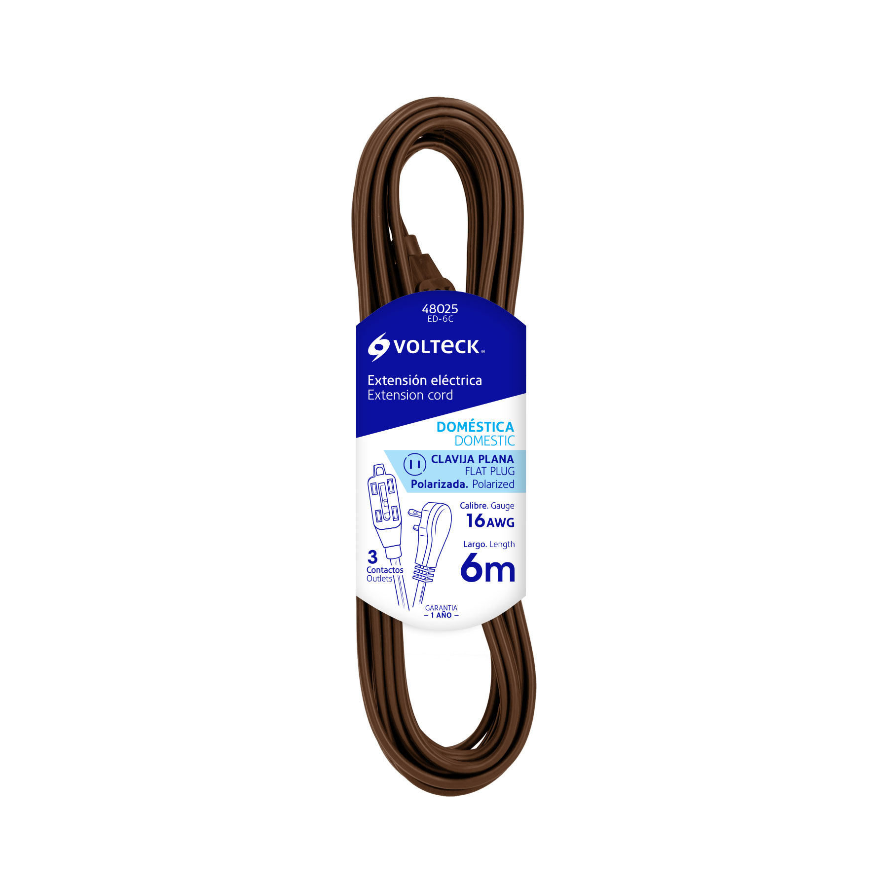 Extensión eléctrica doméstica 6 m clavija plana, café
