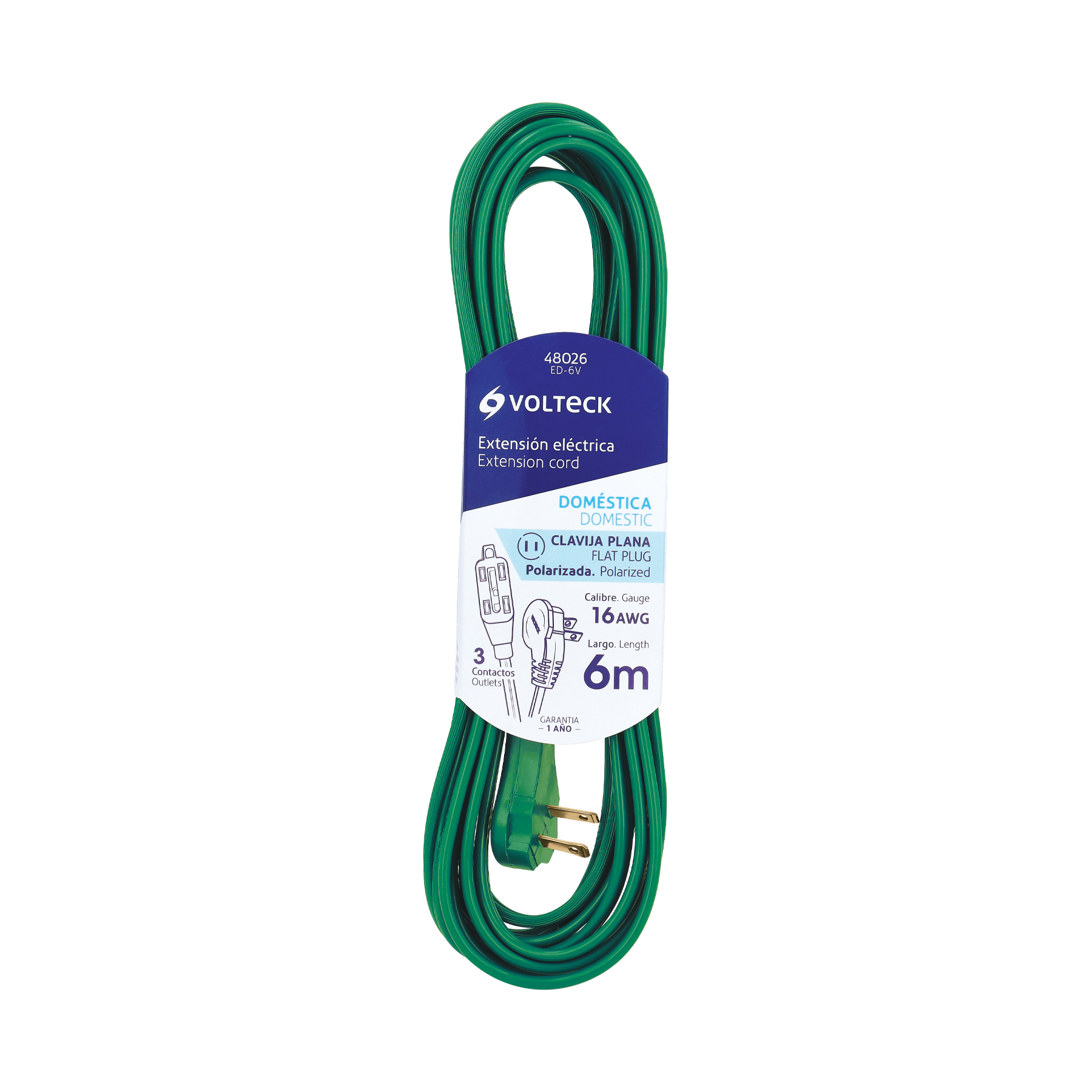 Extensión eléctrica doméstica 6 m clavija plana, verde