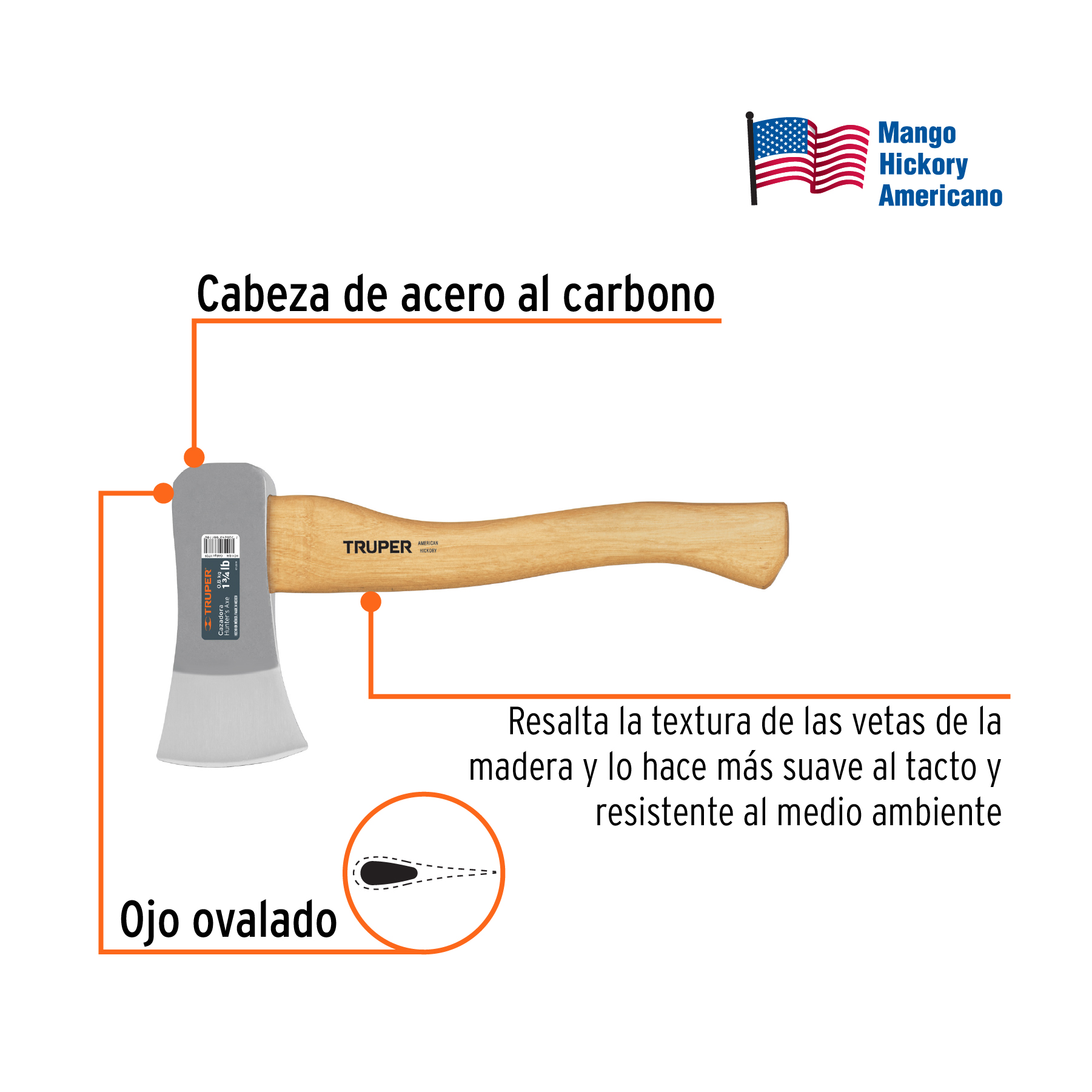 Hacha cazadora 1-3/4 lb, mango hickory 15′, Truper