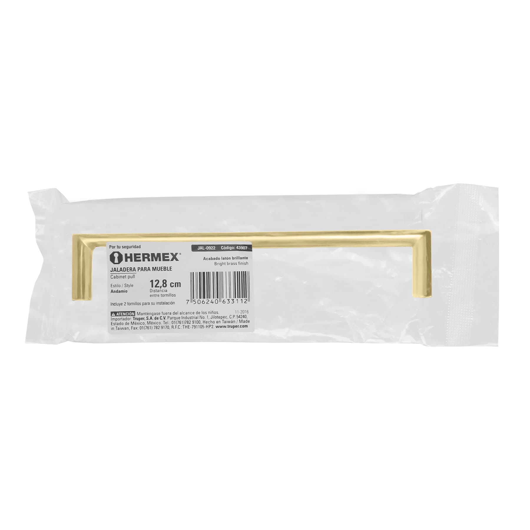 Jaladera de 128mm, línea Andamio, latón brillante, HERMEX