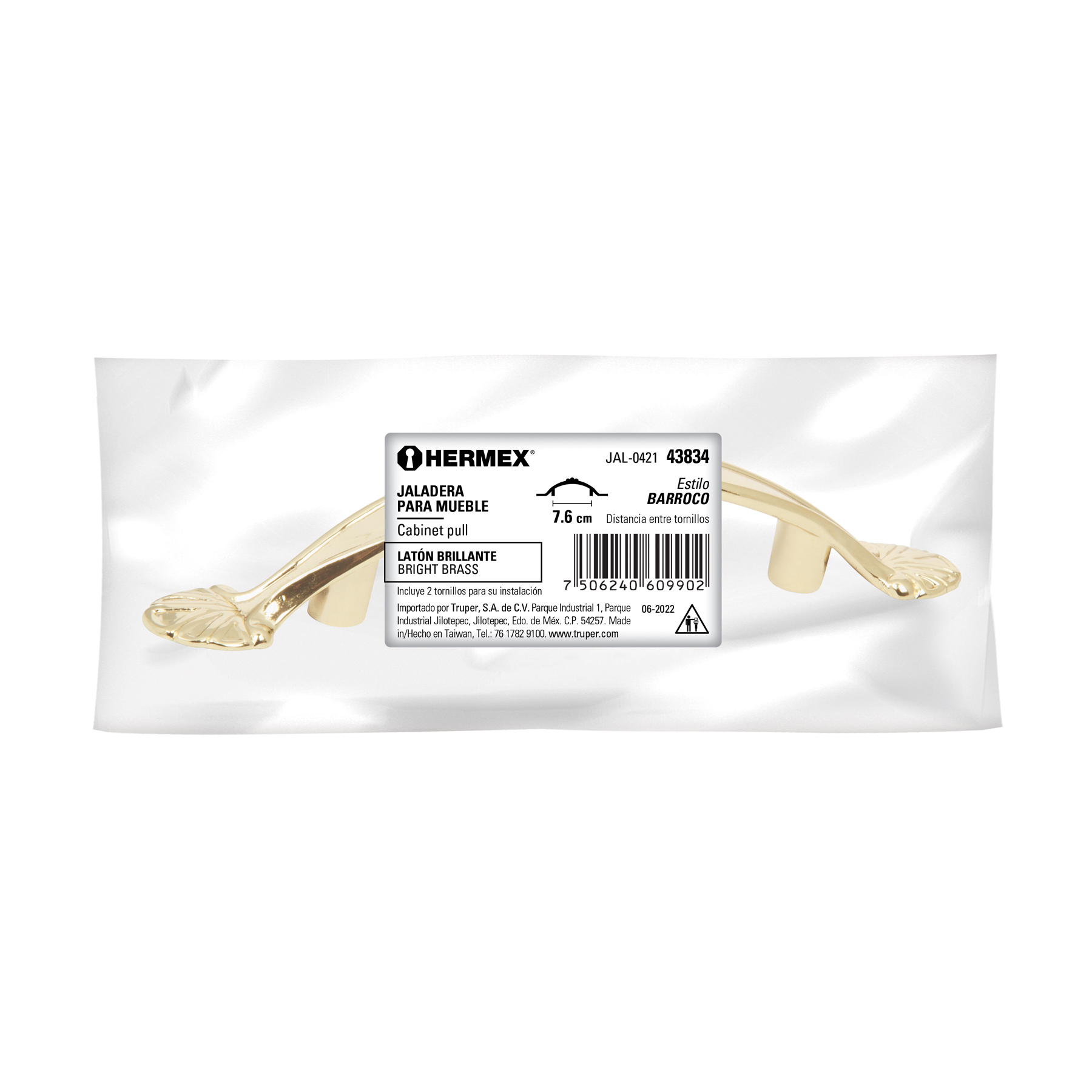 Jaladera metálica de 76 mm estilo ‘Barroco’, latón brillante