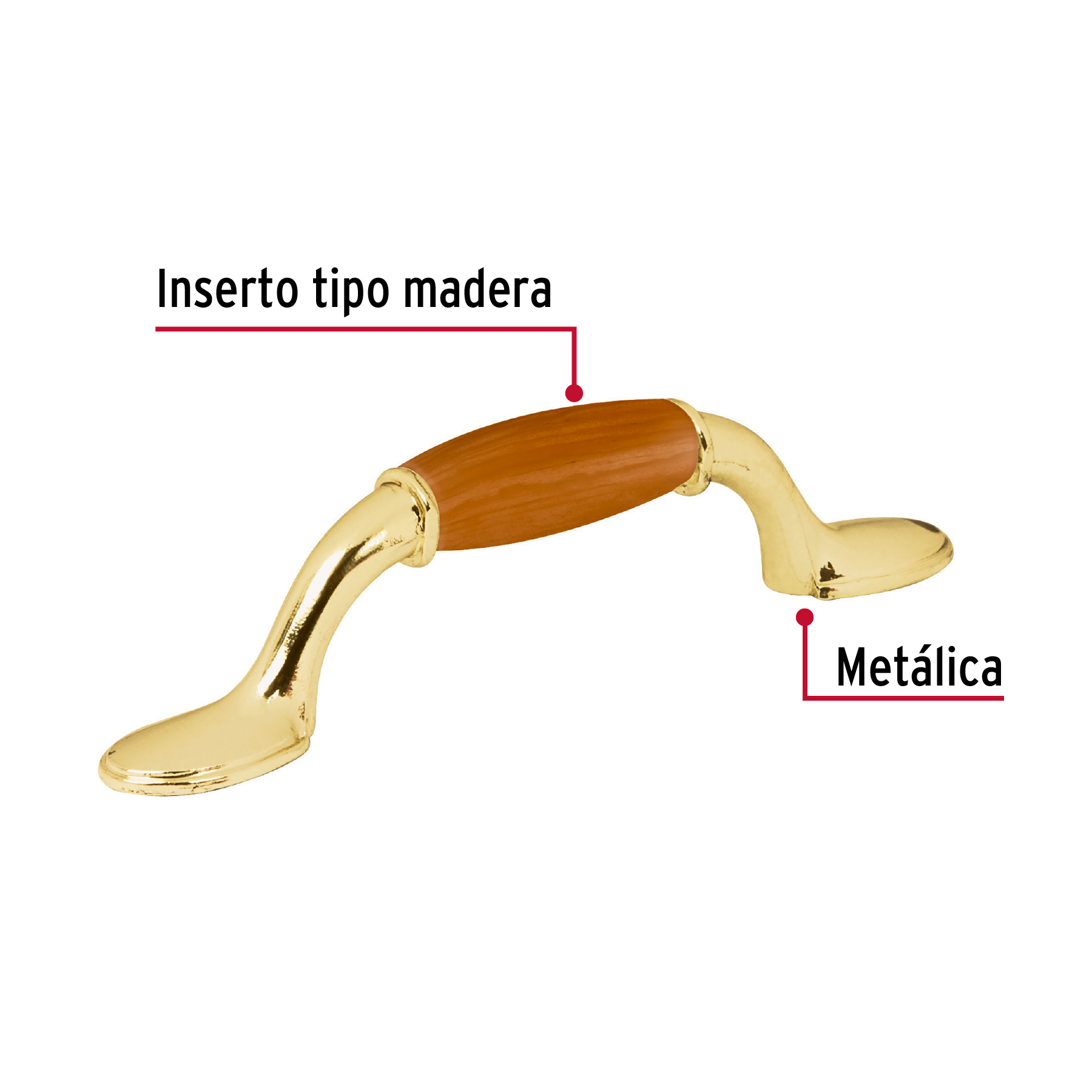 Jaladera metálica, 76mm latón brillante, inserto tipo madera
