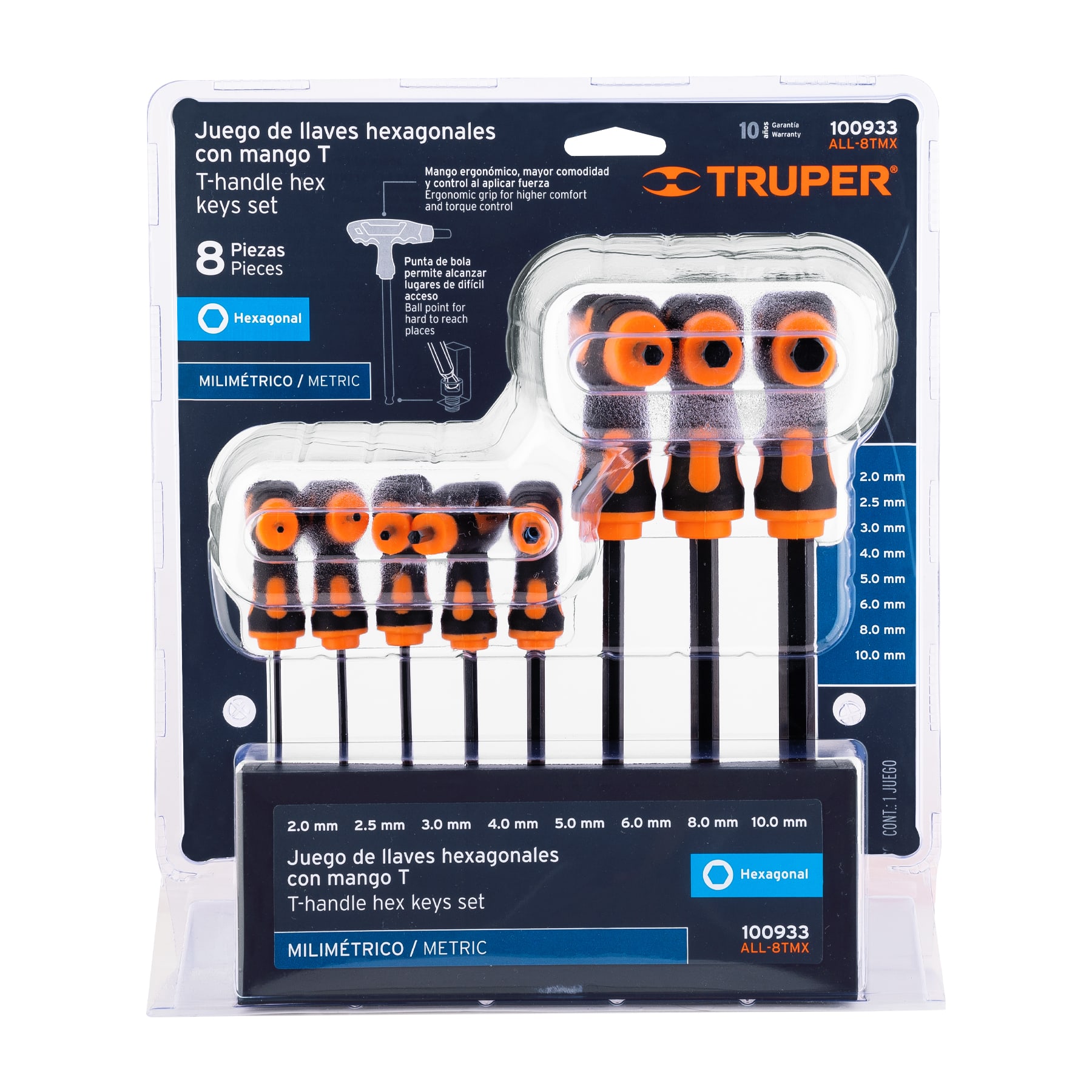 Juego 8 llaves allen mm extralargas mango T, punta de bola