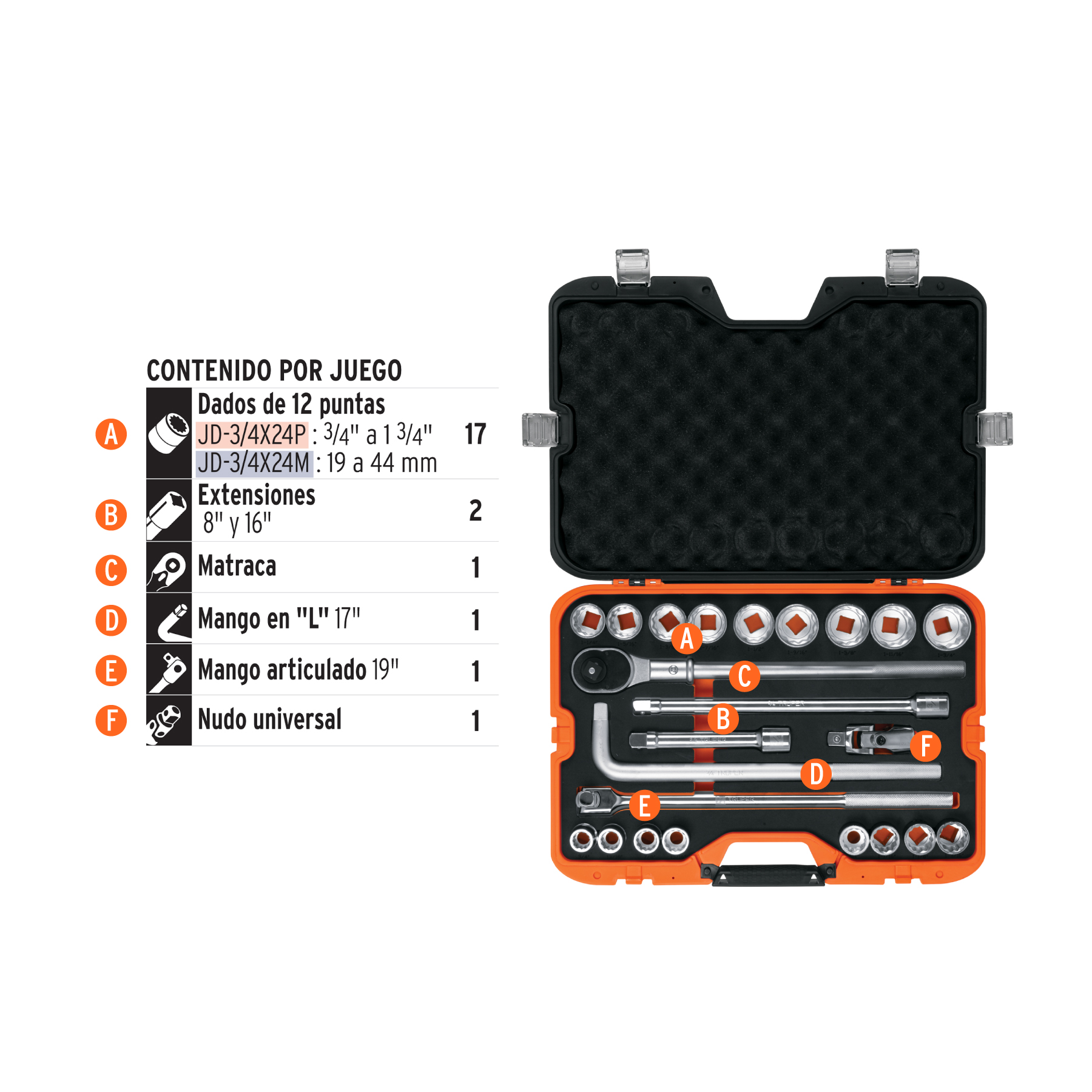 Juego de 23 herramientas cuadro 3/4′ std para mecánico