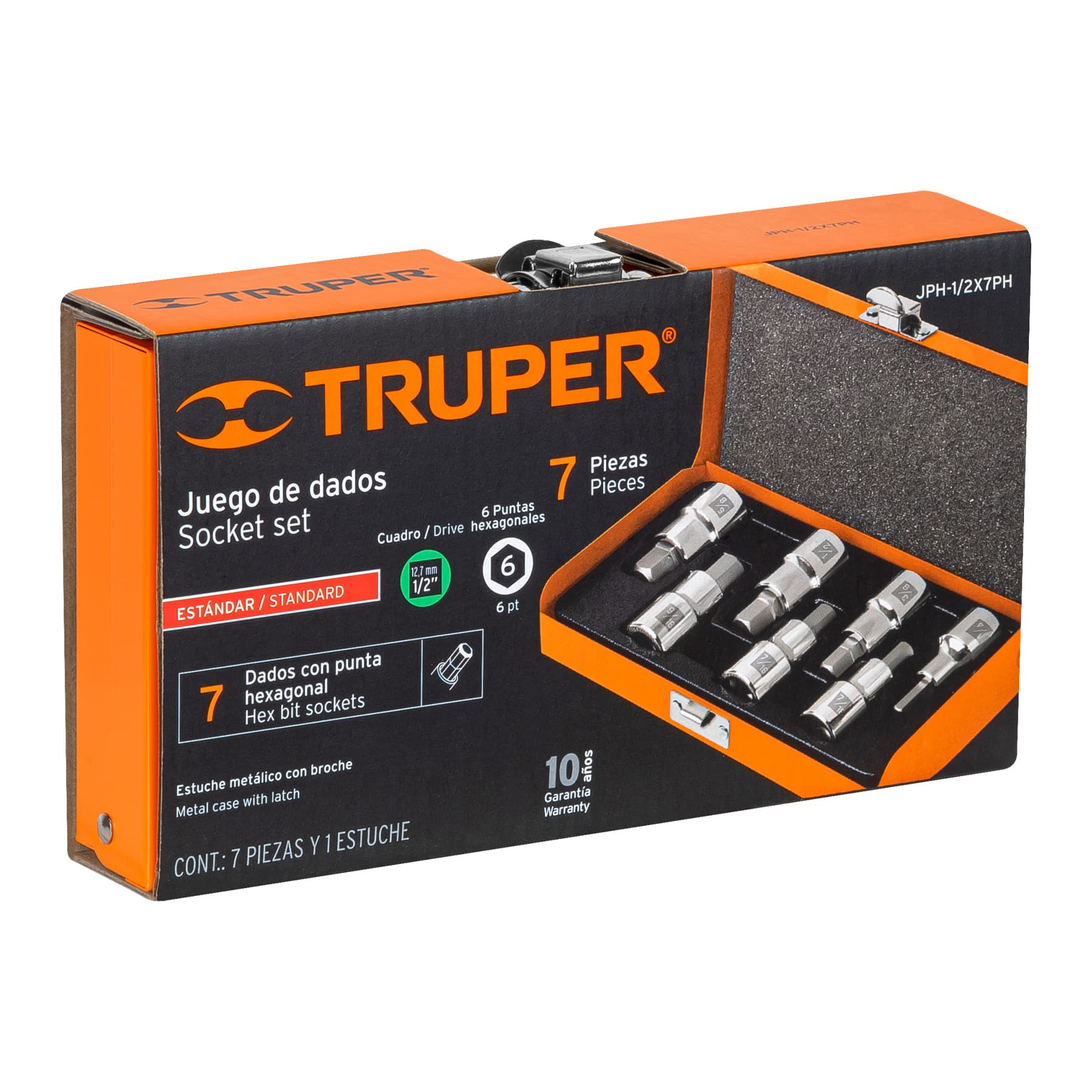 Juego de 7 dados cuadro 1/2′ punta hex std, estuche metálico