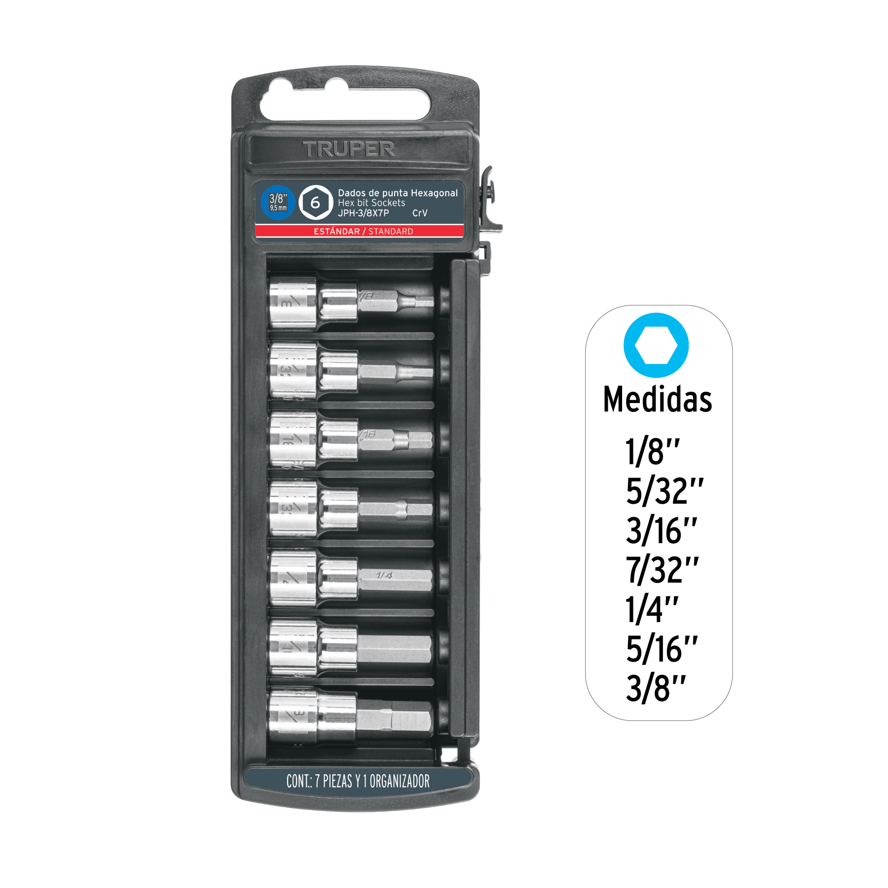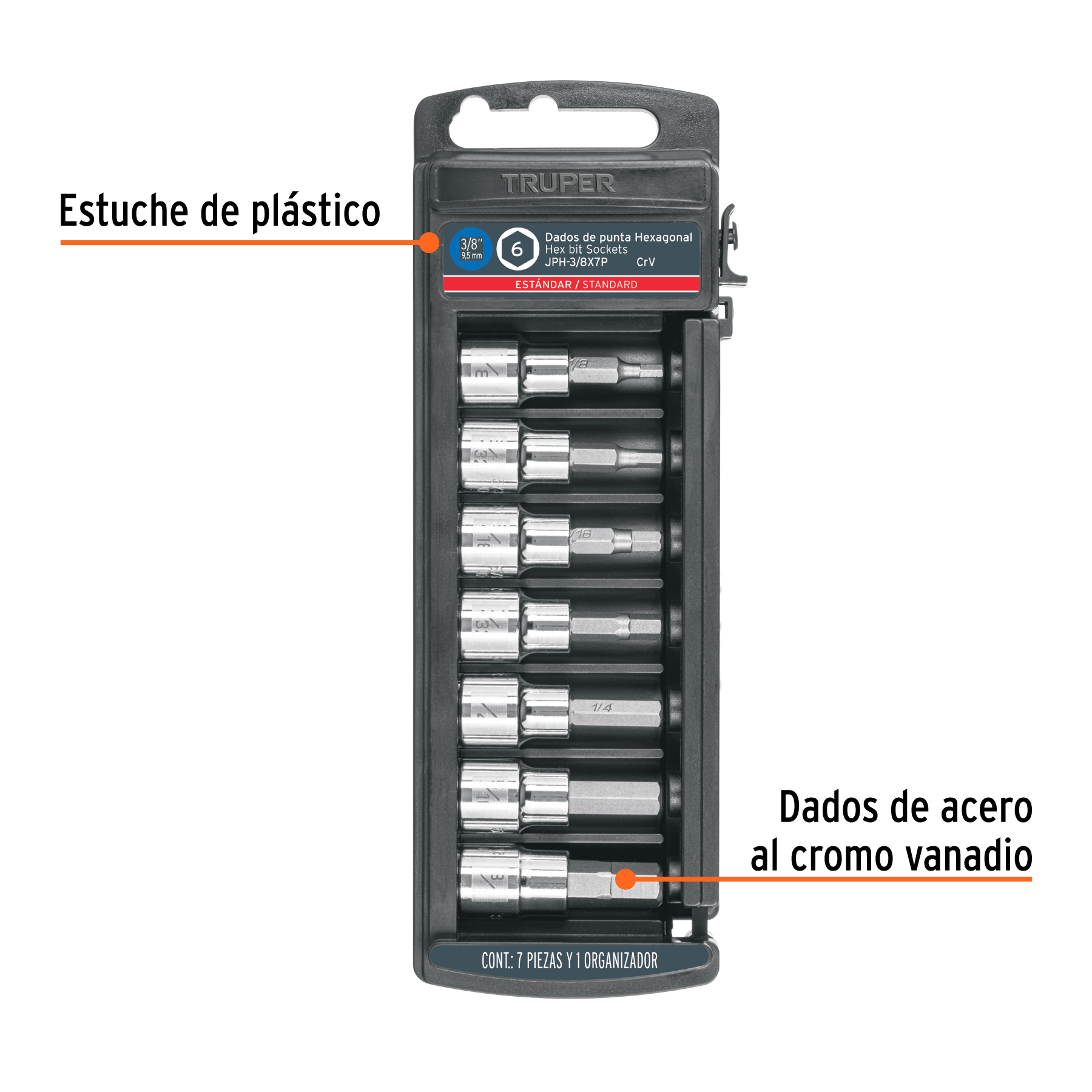 Juego de 7 dados punta hexagonal std, cuadro 3/8′, Truper