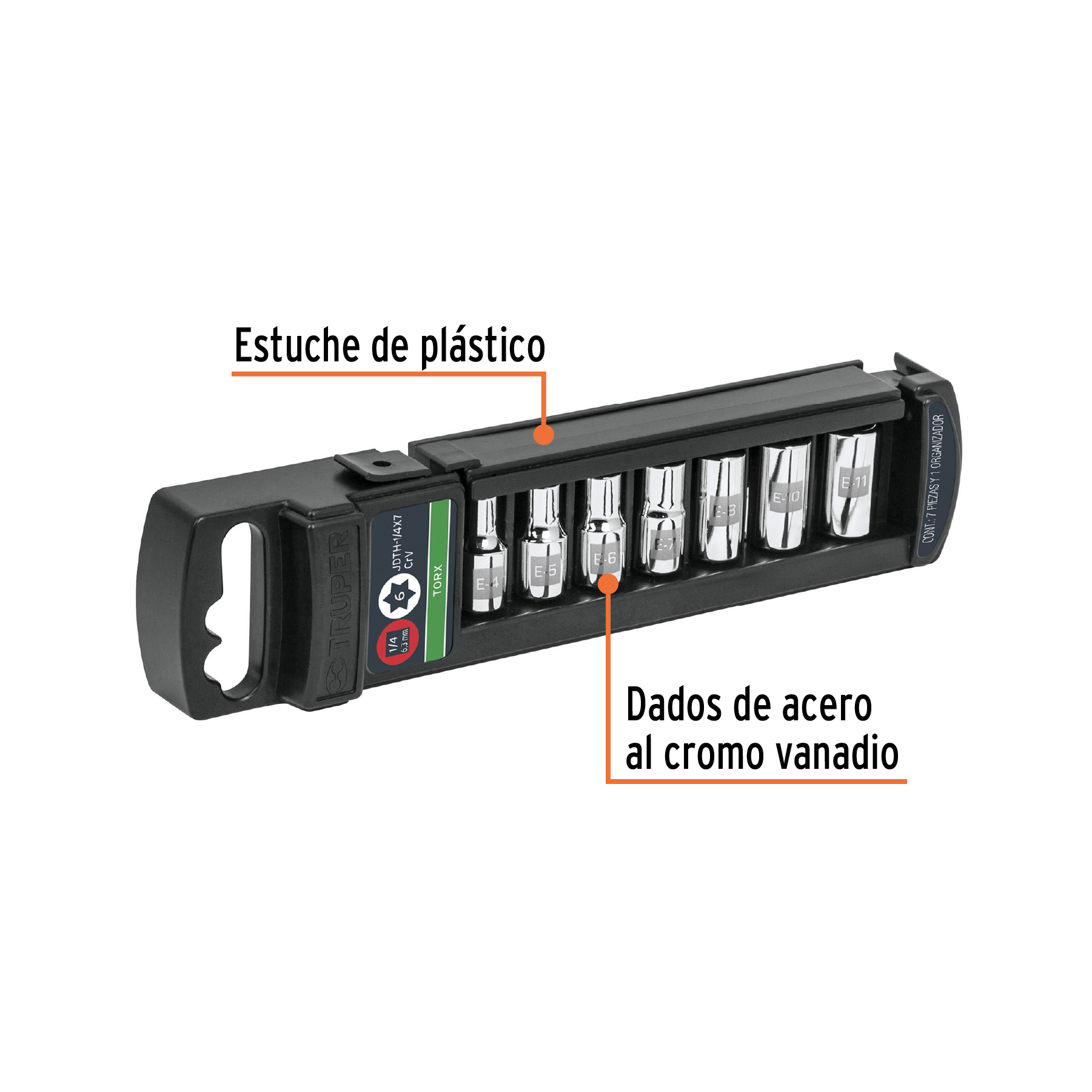 Contenido: 1 Dado punta torx E4 1 Dado punta torx E5 1 Dado punta torx E6 1 Dado punta torx E7 1 Dado punta torx E8 1 Dado punta torx E10 1 Dado punta torx E11 Estuche plástico para almacenar los dados