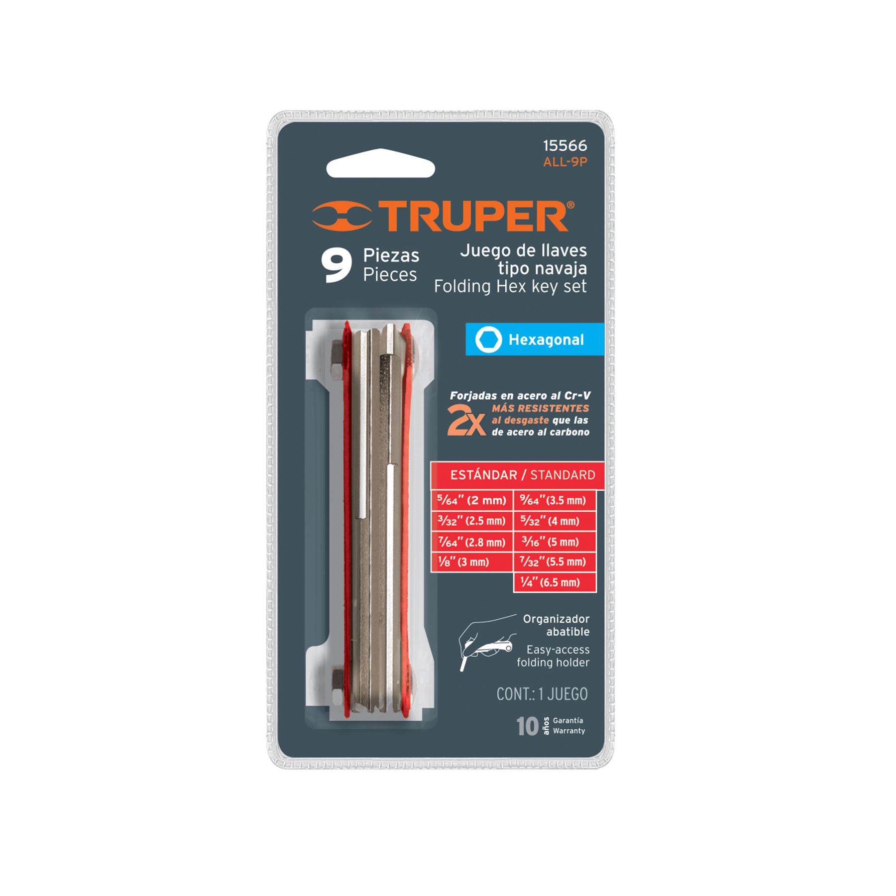 Organizador abatible 1 Llave de 5/64″ 1 Llave de 3/32″ 1 Llave de 7/64″ 1 Llave de 1/8″ 1 Llave de 9/64″ 1 Llave de 5/32″ 1 Llave de 3/16″ 1 Llave de 7/32″ 1 Llave de 1/4 Recubrimiento satinado 3 veces más resistente a la corrosión