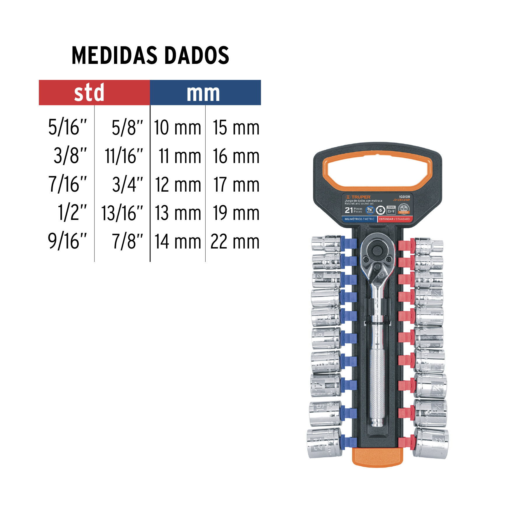 Juego de dados mm y std con matraca, cuadro 3/8′, Truper