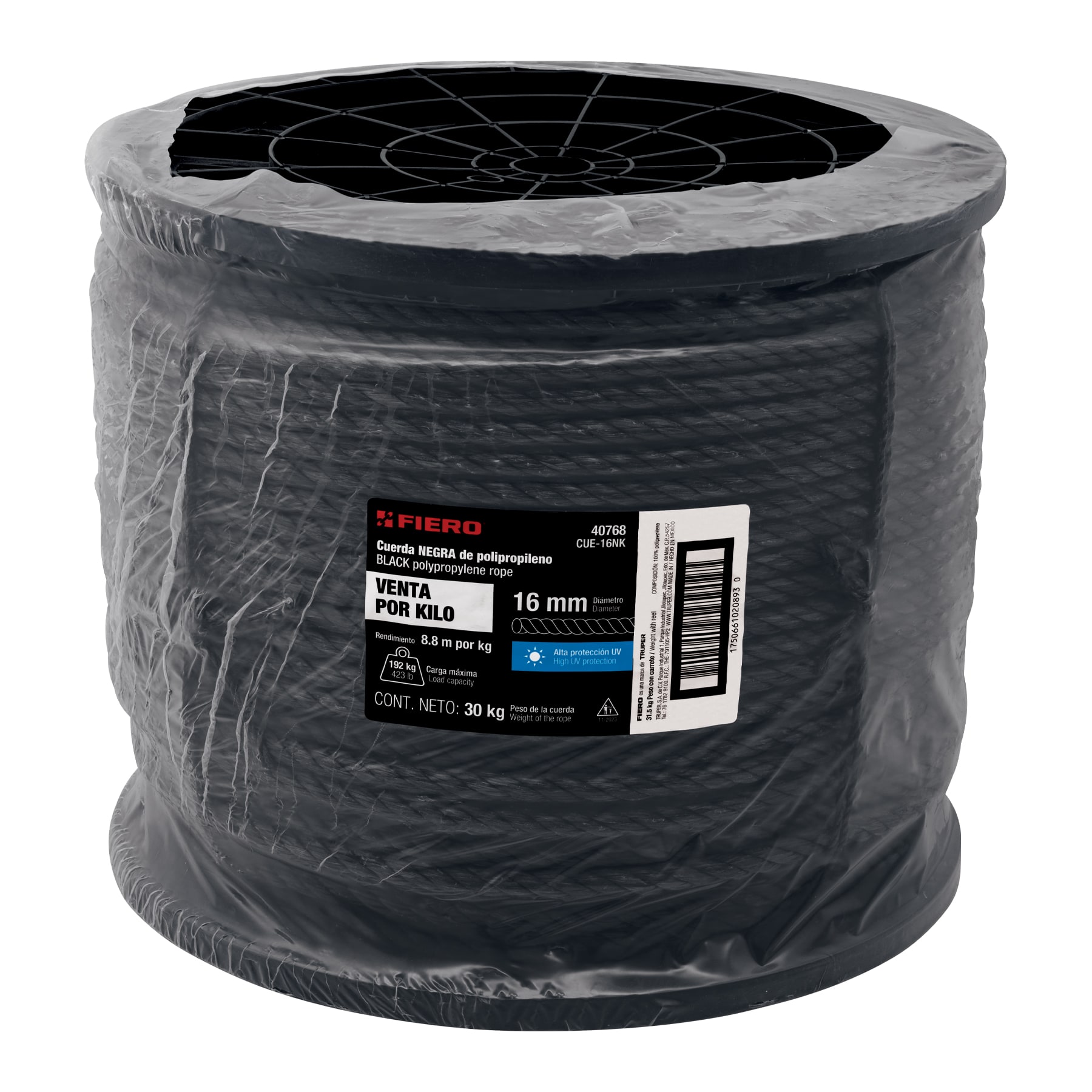 Kilo de cuerda negra de polipropileno 16 mm, carrete 30kg
