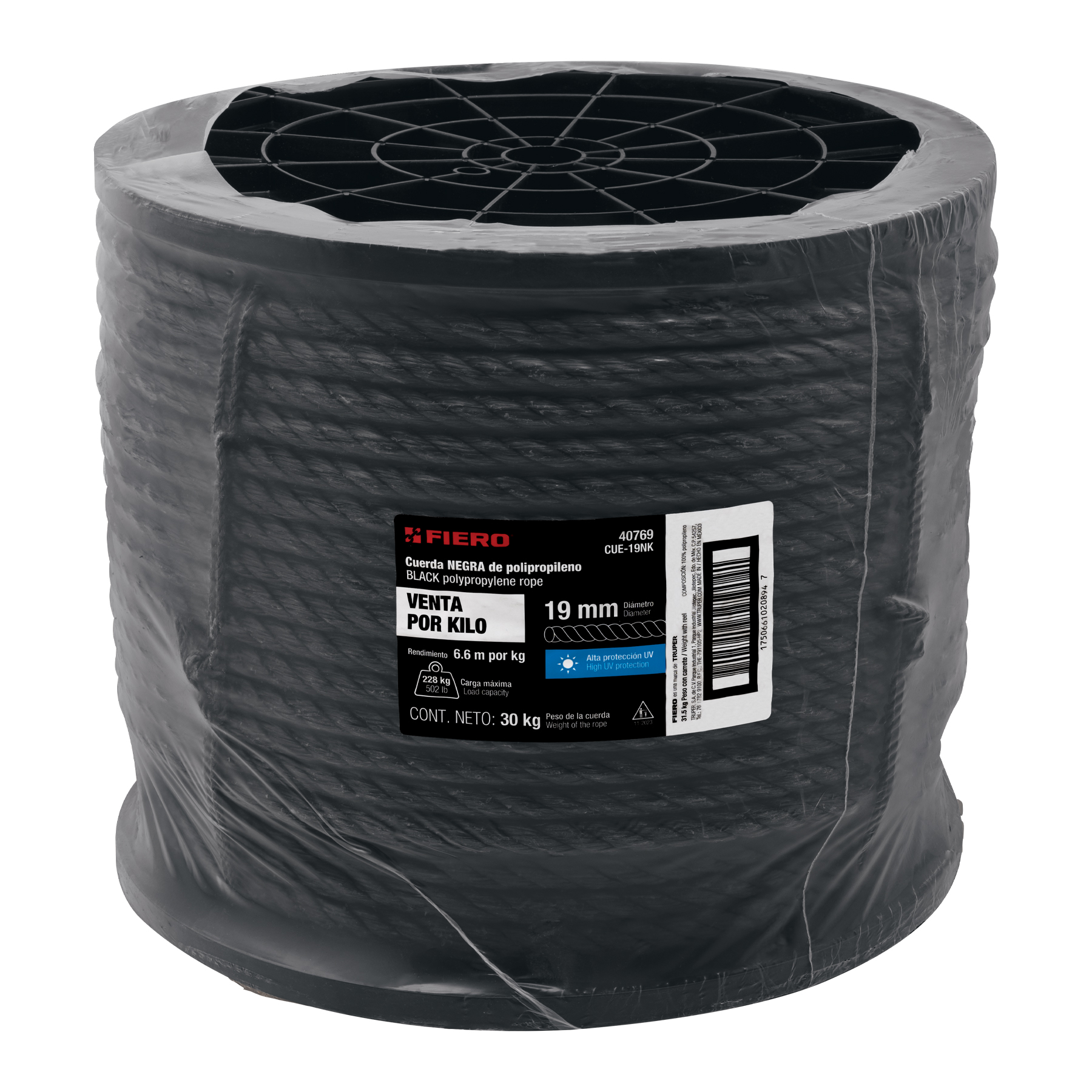 Kilo de cuerda negra de polipropileno 19 mm, carrete 30kg