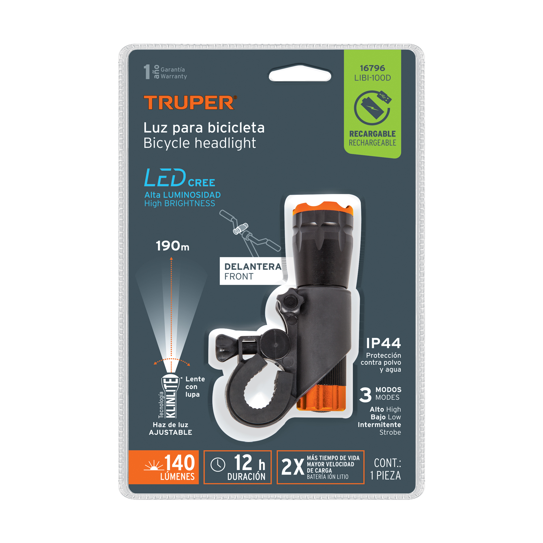 Linterna delantera para bicicleta, 140 lm, recargable