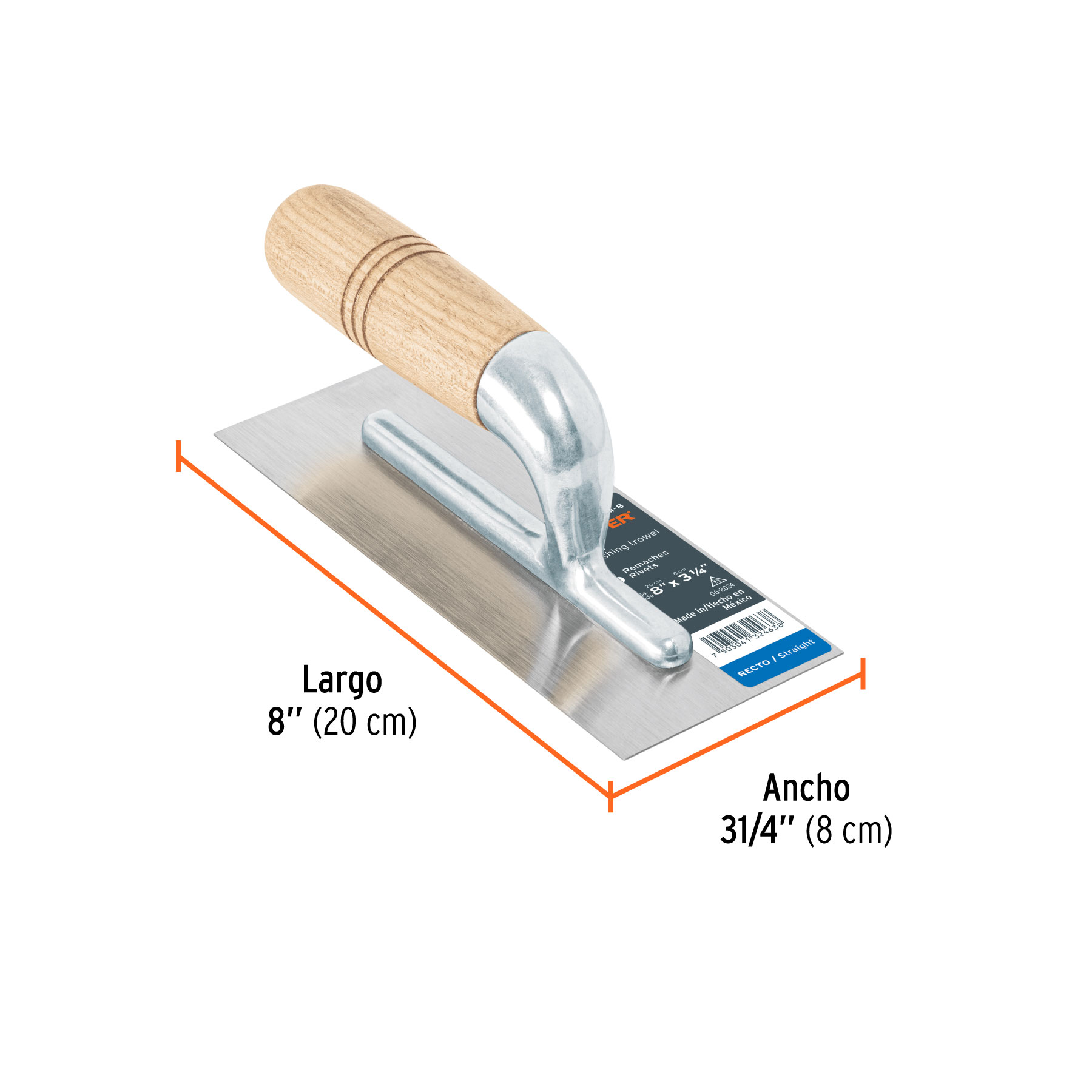 Llana mini 8′ canto recto, 6 remaches, mgo madera, Truper