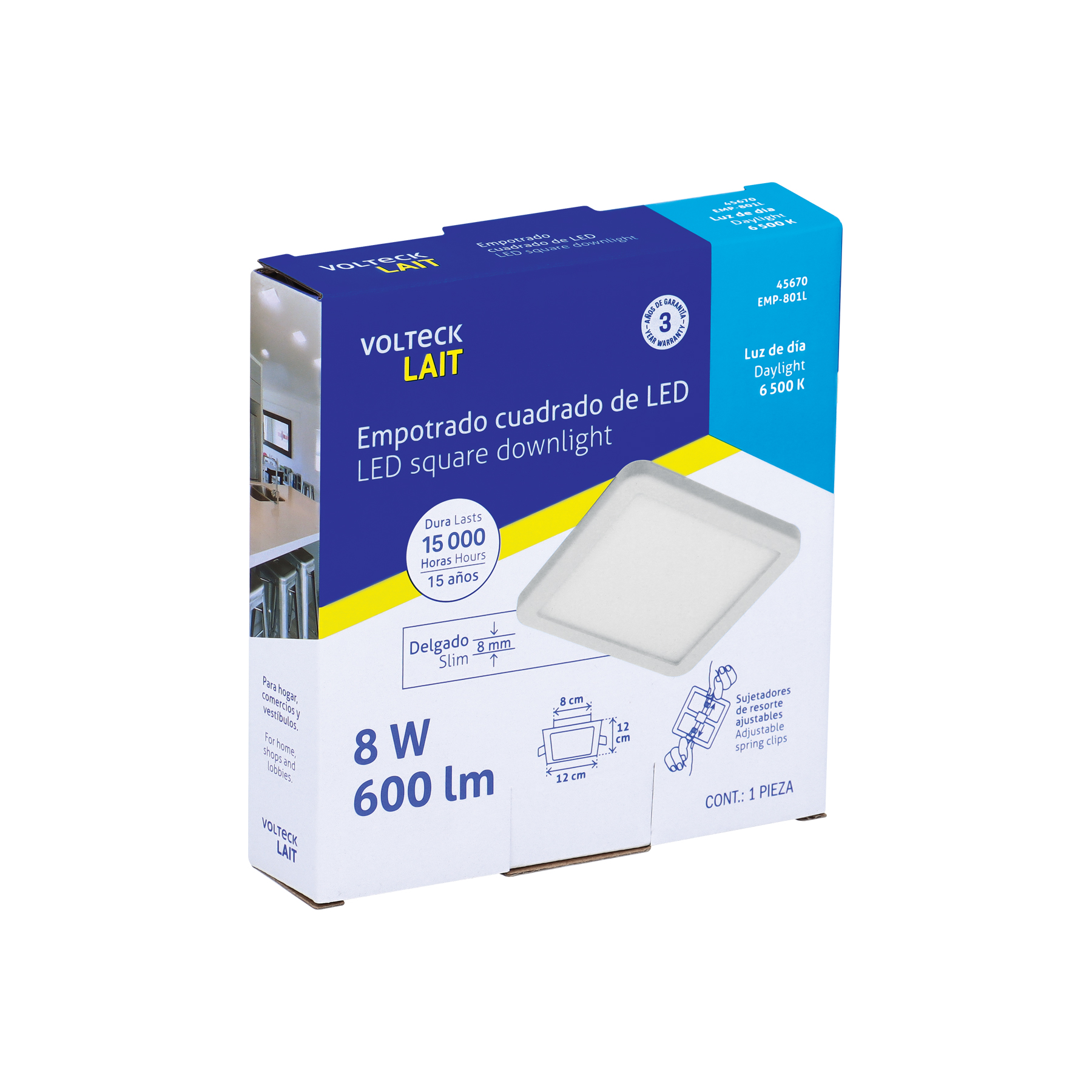 Luminario LED plafón 8W 6500K, ajustable, cuadrado, VOLTECK