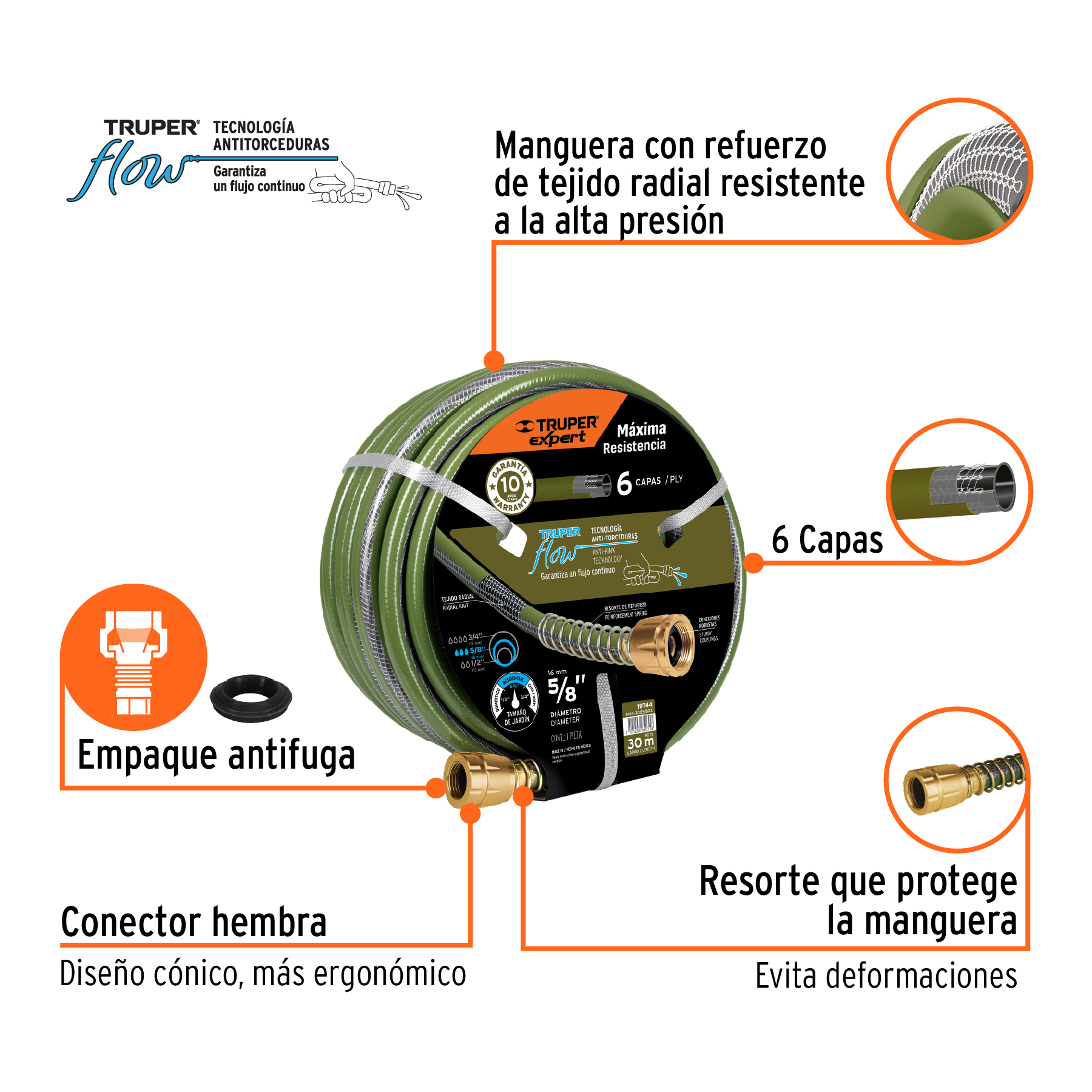 Manguera 5/8′ anti-torceduras 6 capas 30m conexiones d/metal