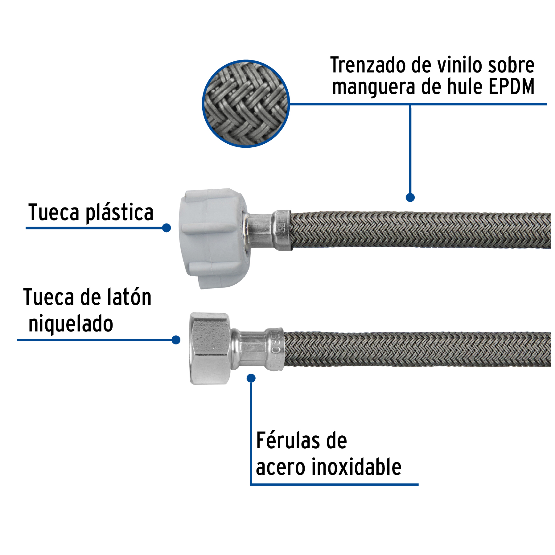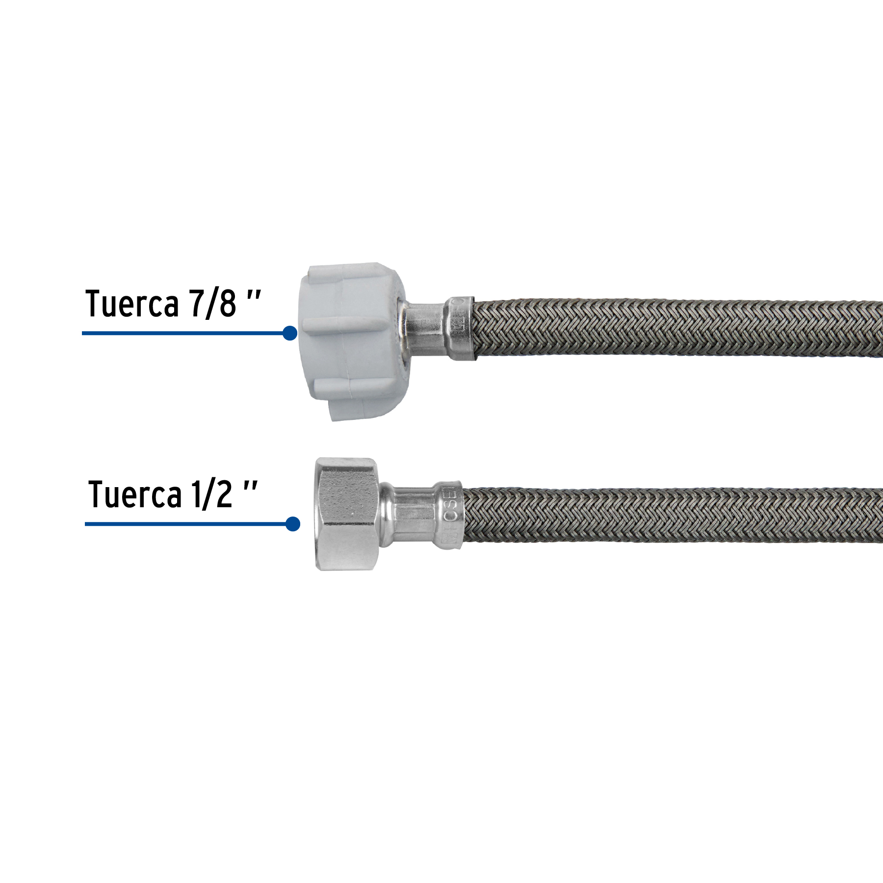 Manguera p/WC, vinilo gris, 1/2’x7/8′, 60cm, plástico/latón