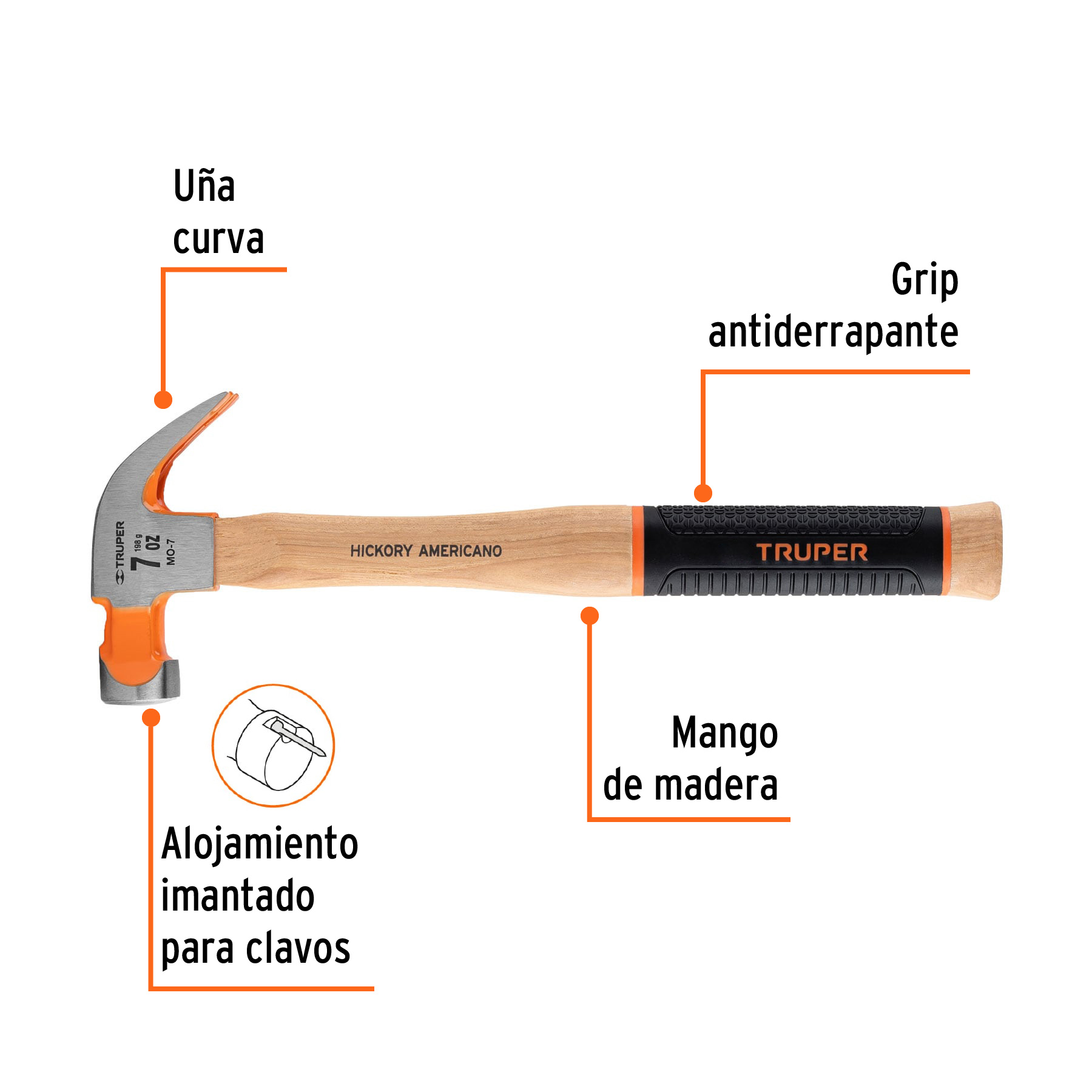 Martillo pulido 7 oz uña curva, mango hickory, Truper Grip