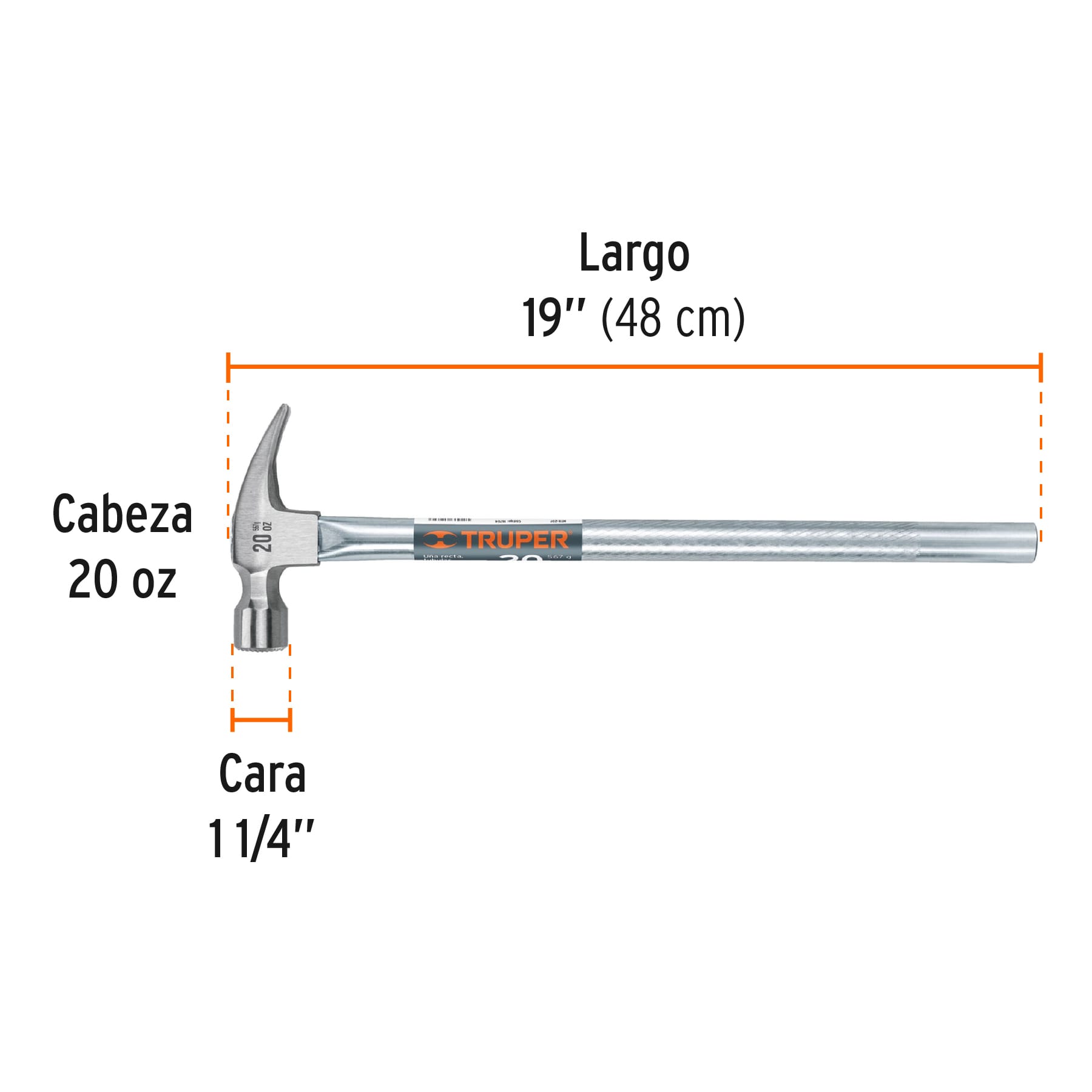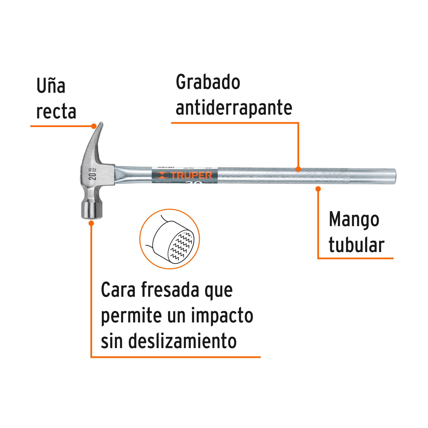 Martillo tubular pulido 20oz cara fresada, uña recta, Truper