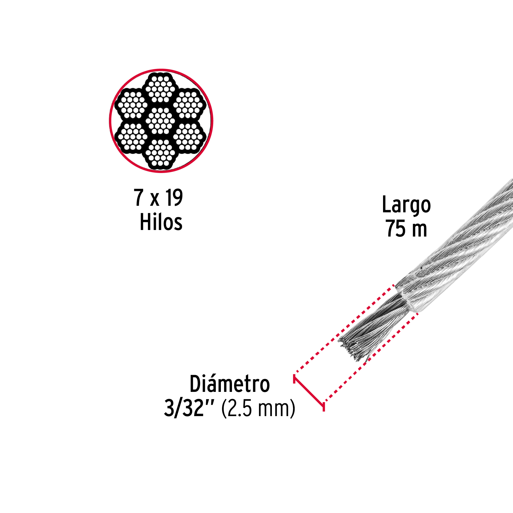 Metro cable flexible 3/32′ acero 7×19 recubierto PVC, 75 m