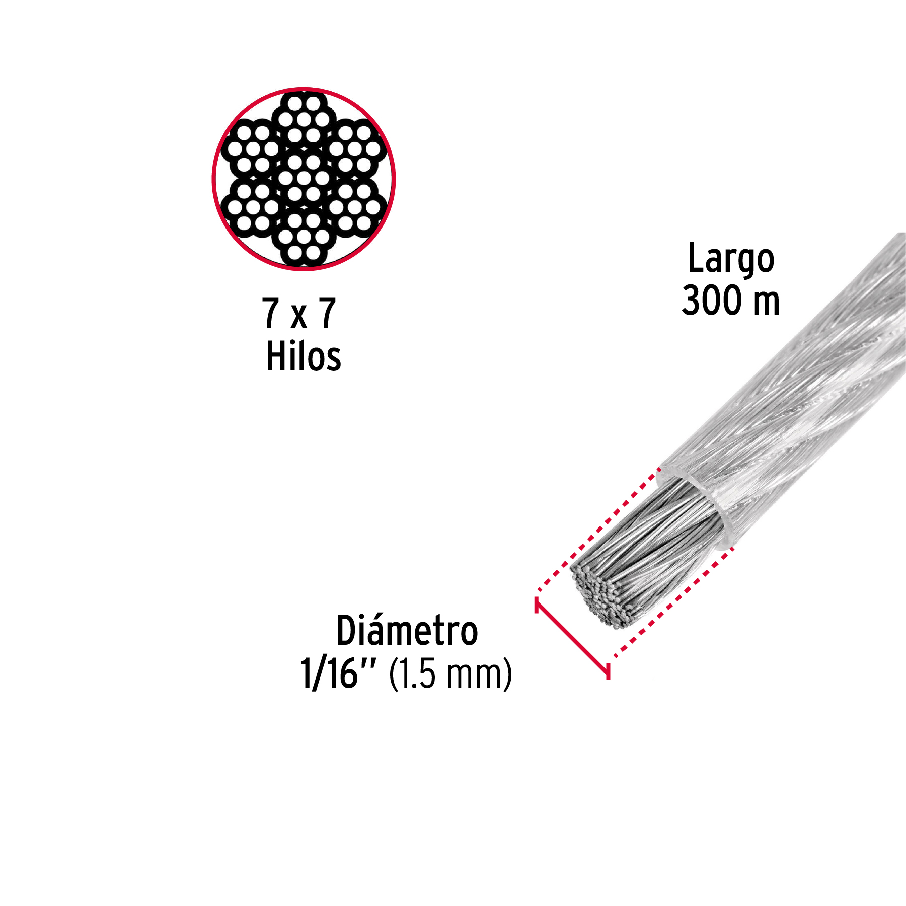 Metro de cable rígido 1/16′ acero 7×7 recubierto PVC, 300 m