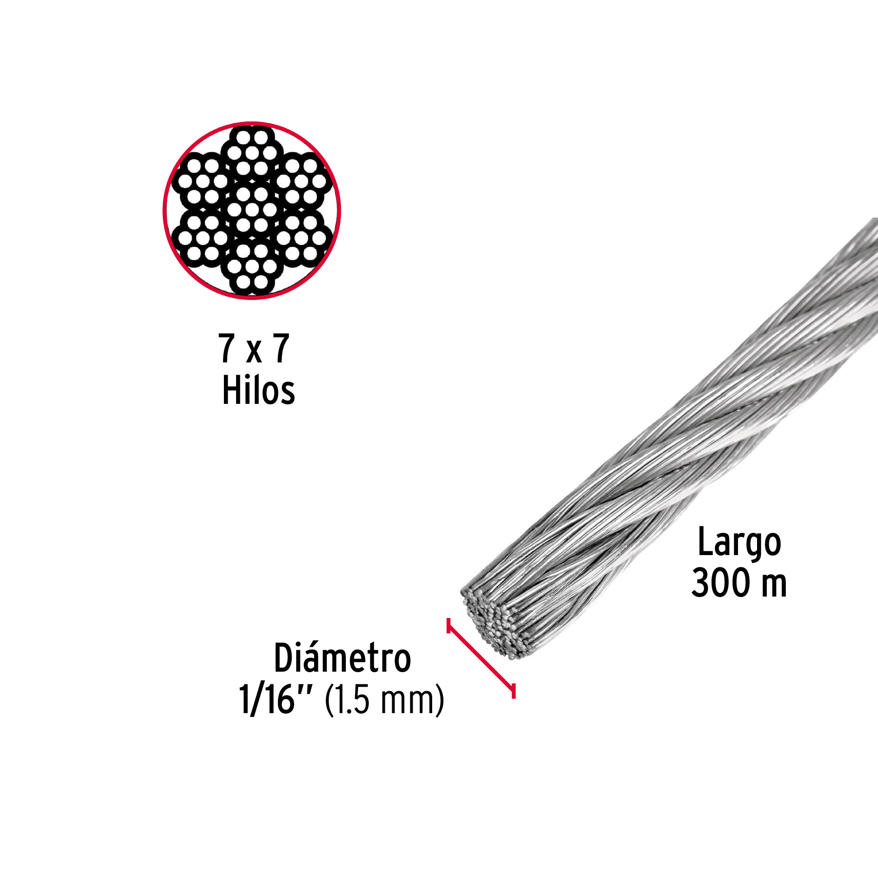 Metro de cable rígido 1/16′ de acero 7×7 hilos, 300 m, FIERO