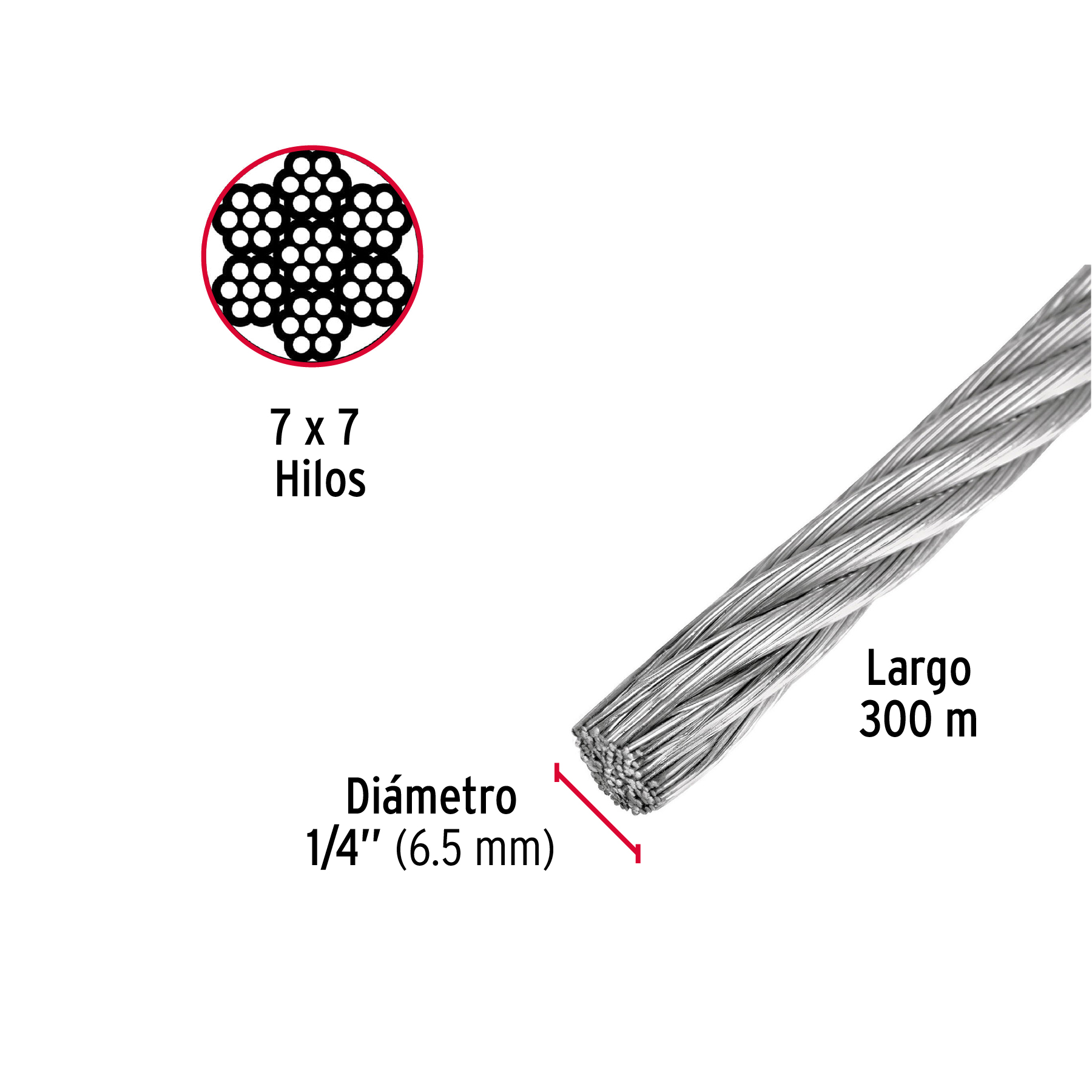 Metro de cable rígido 1/4′ de acero 7×7 hilos, 300 m, FIERO