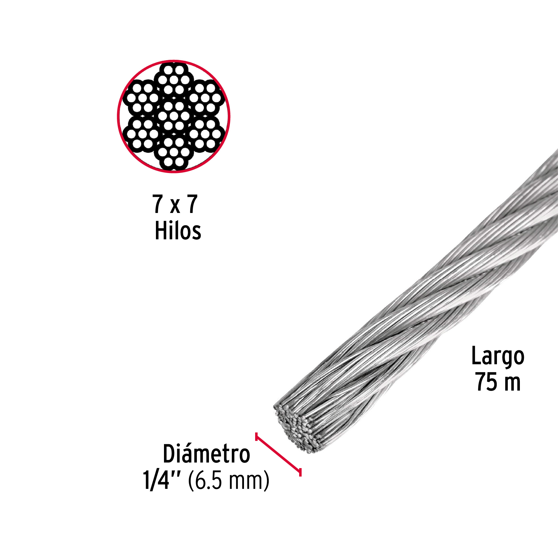 Metro de cable rígido 1/4′ de acero 7×7 hilos, 75 m, FIERO