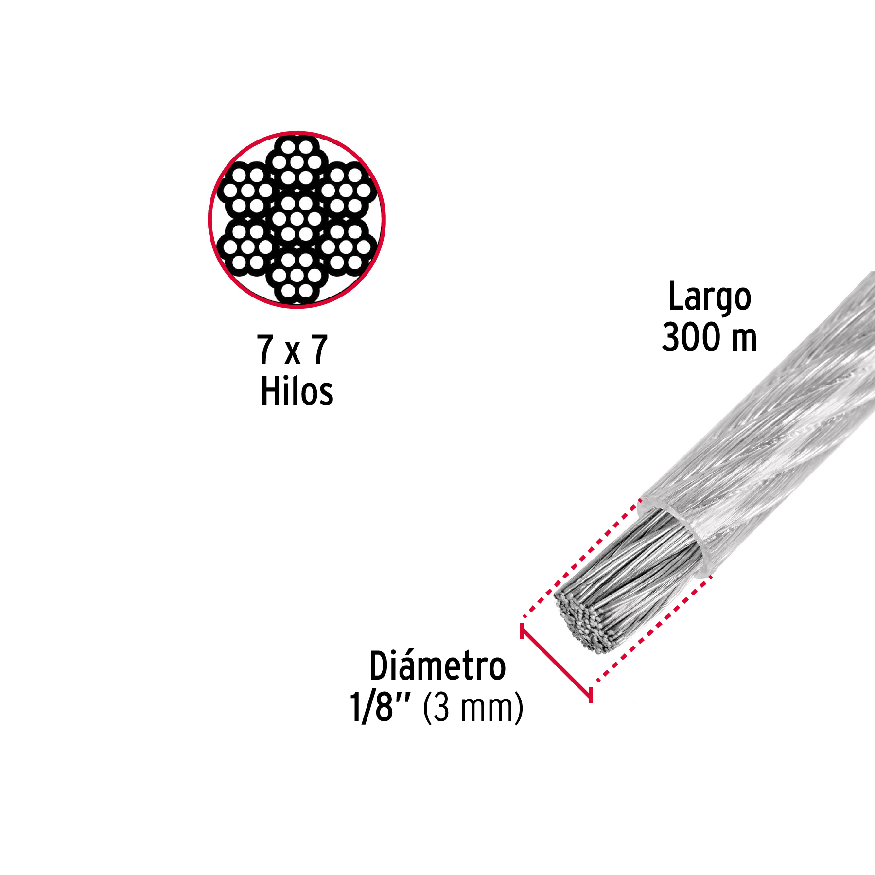 Metro de cable rígido 1/8′ acero 7×7 recubierto PVC, 300 m