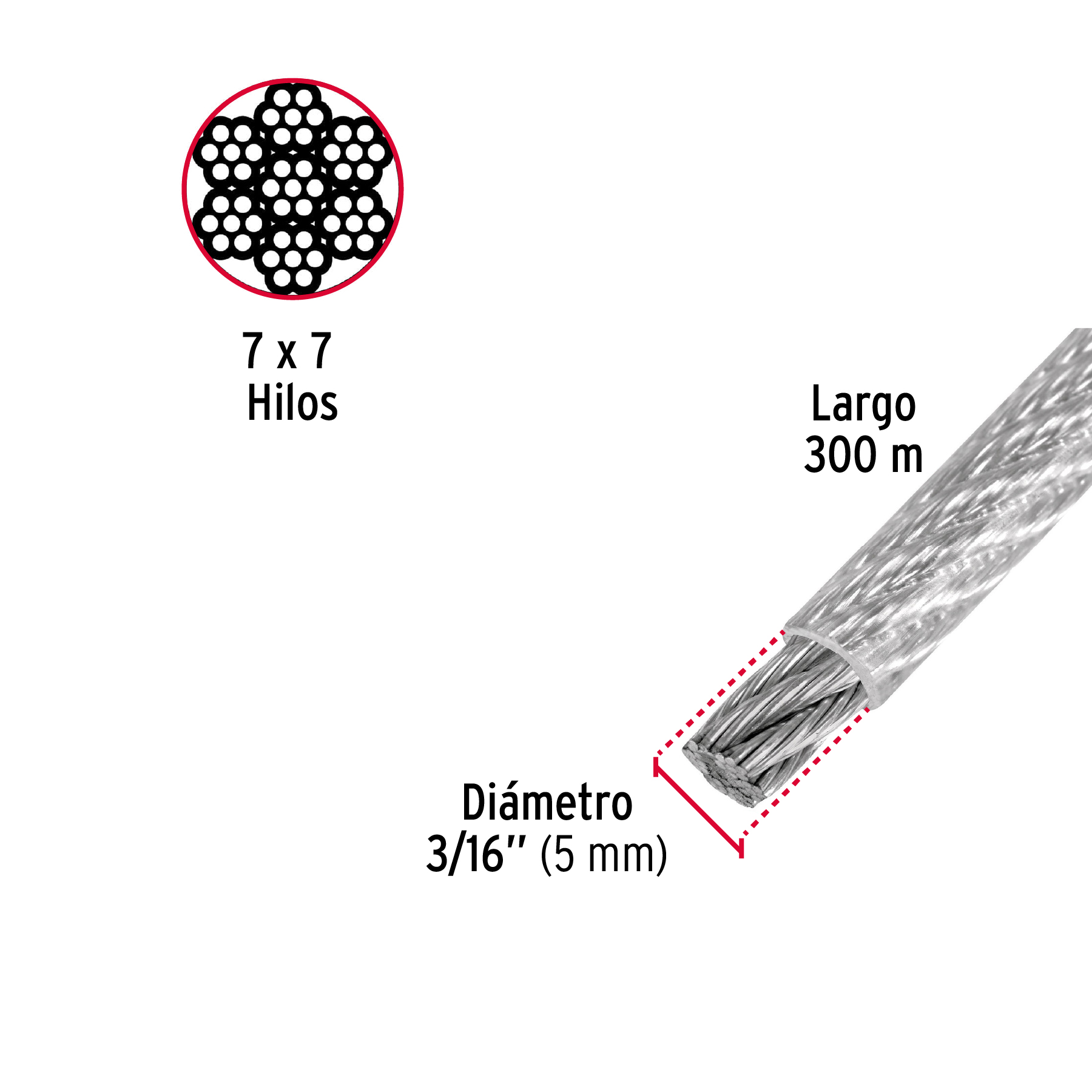 Metro de cable rígido 3/16′ acero 7×7 recubierto PVC, 300 m