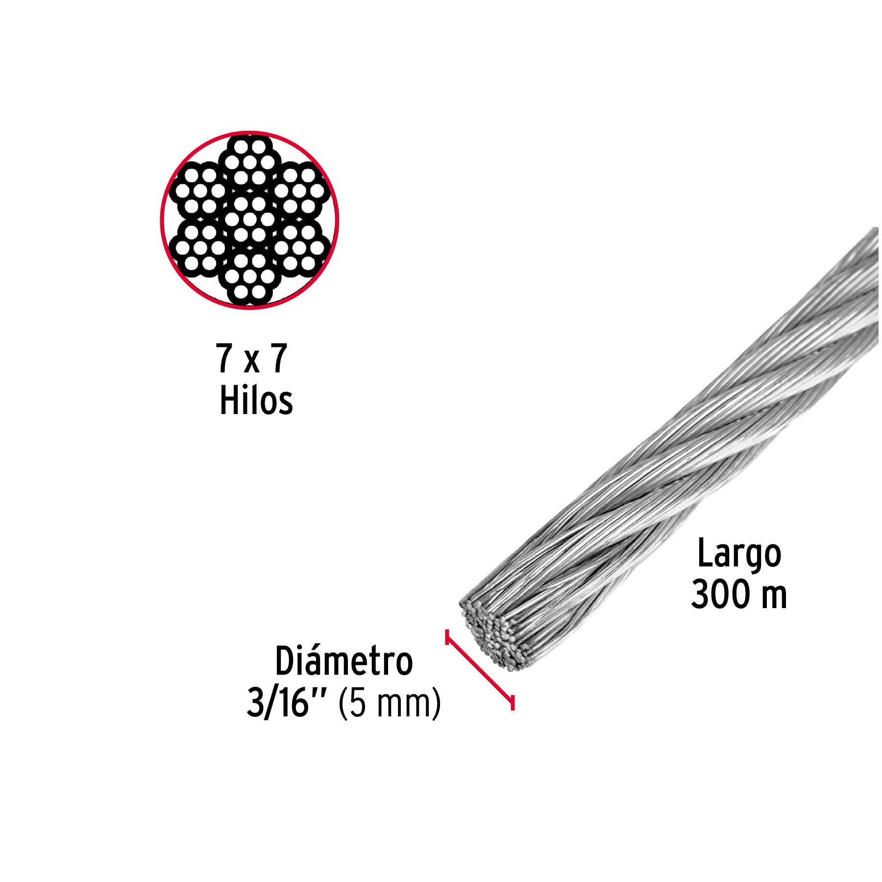 Metro de cable rígido 3/16′ de acero 7×7 hilos, 300 m, FIERO