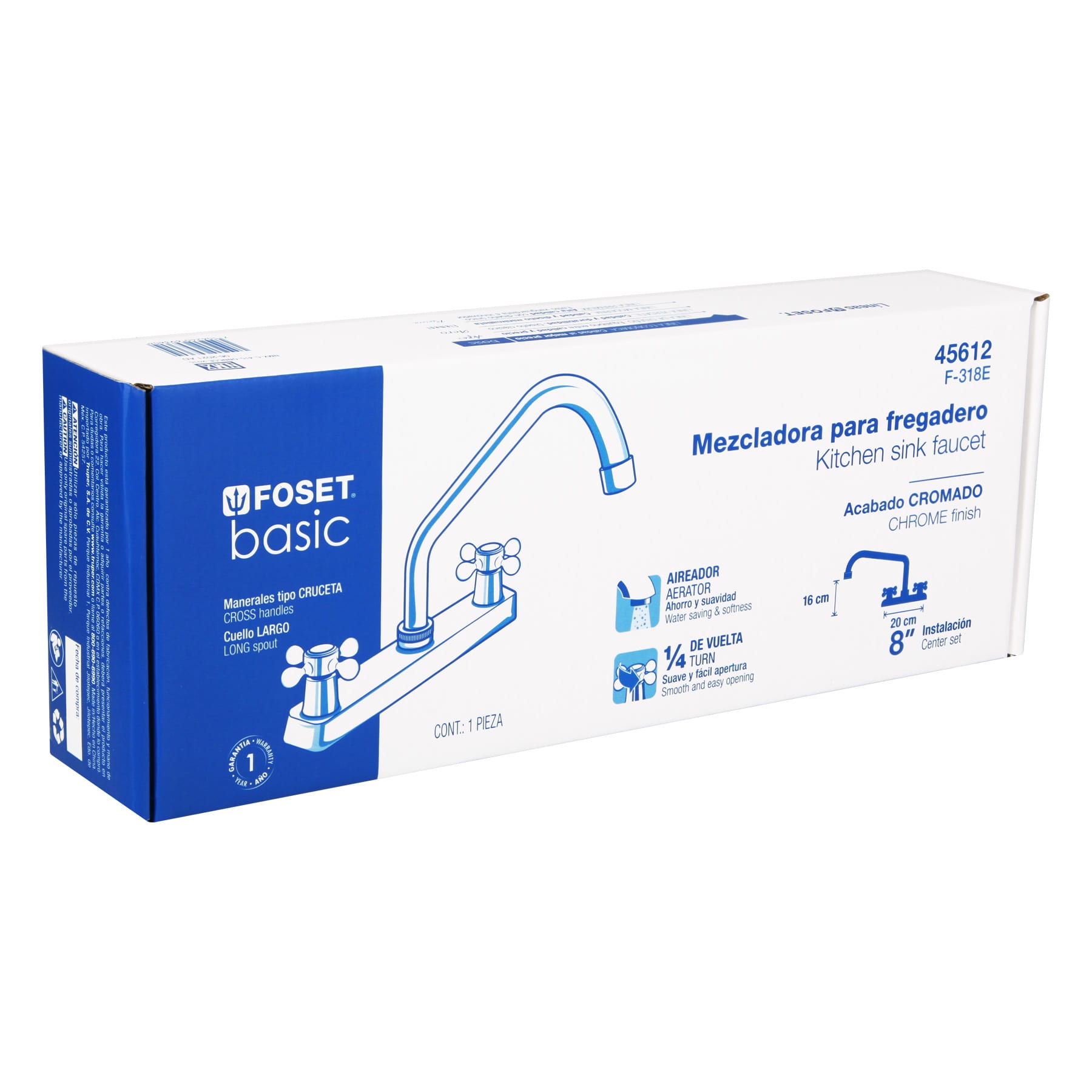 Mezcladora 8′ fregadero cromo, cuello largo, cruceta, BASIC