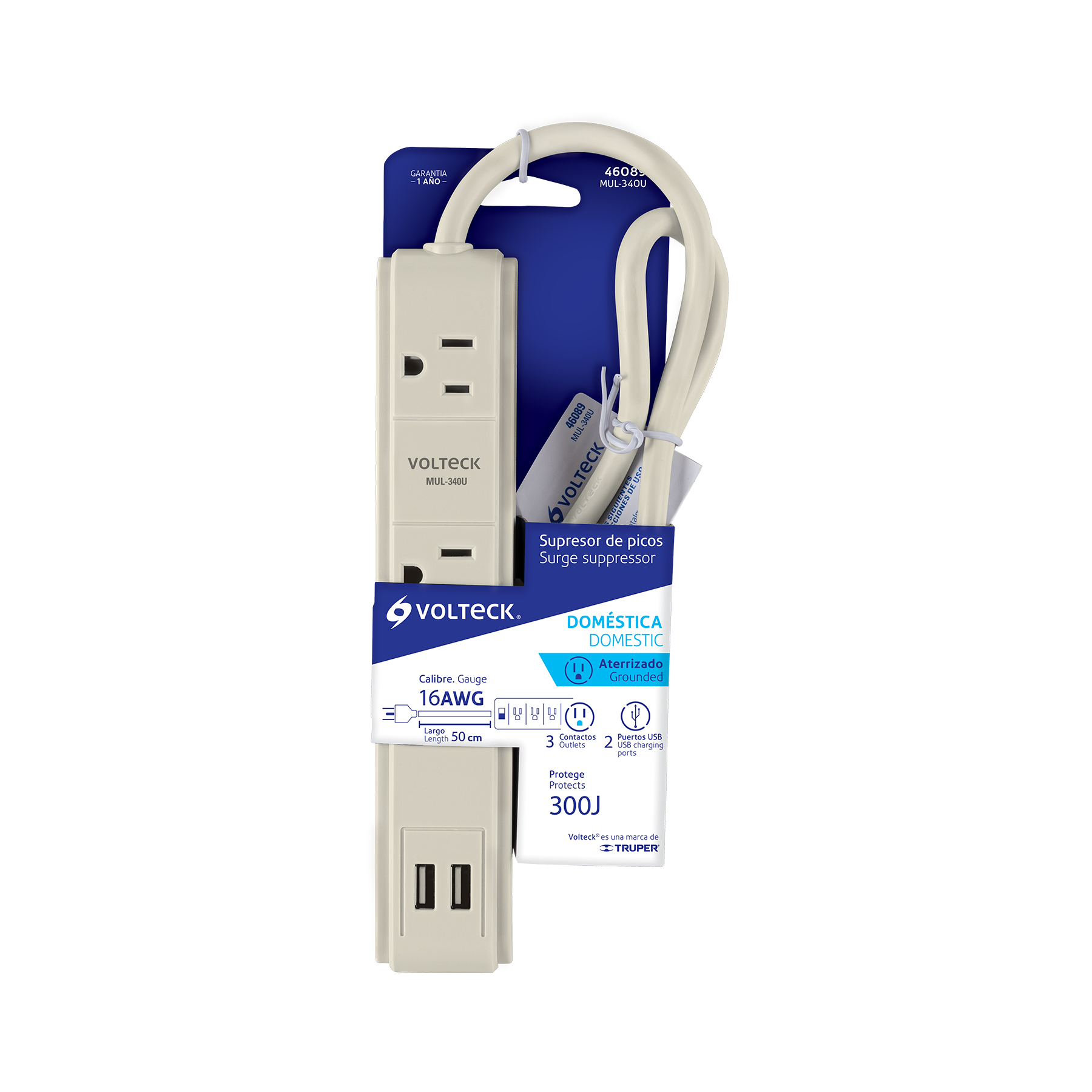 Multicontacto 16 AWG 3 entradas 2 puertos USB supresor 300 J